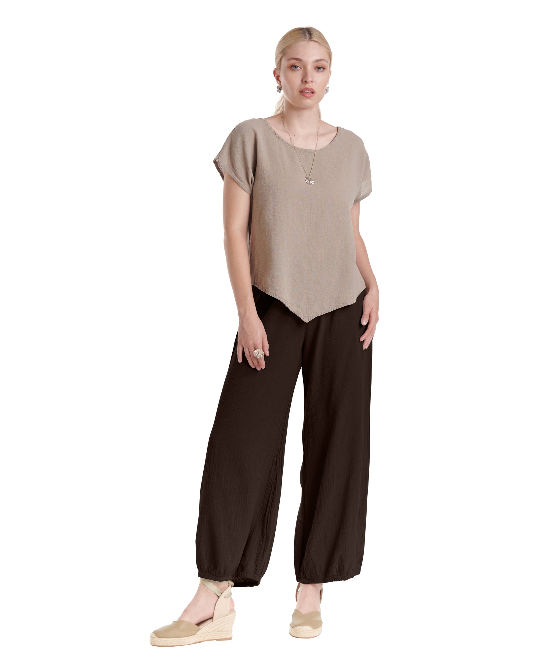 A petite cotton gauze pant with elasticized ankles and a streamlined silhouette without pockets, offering a clean and minimalist look.