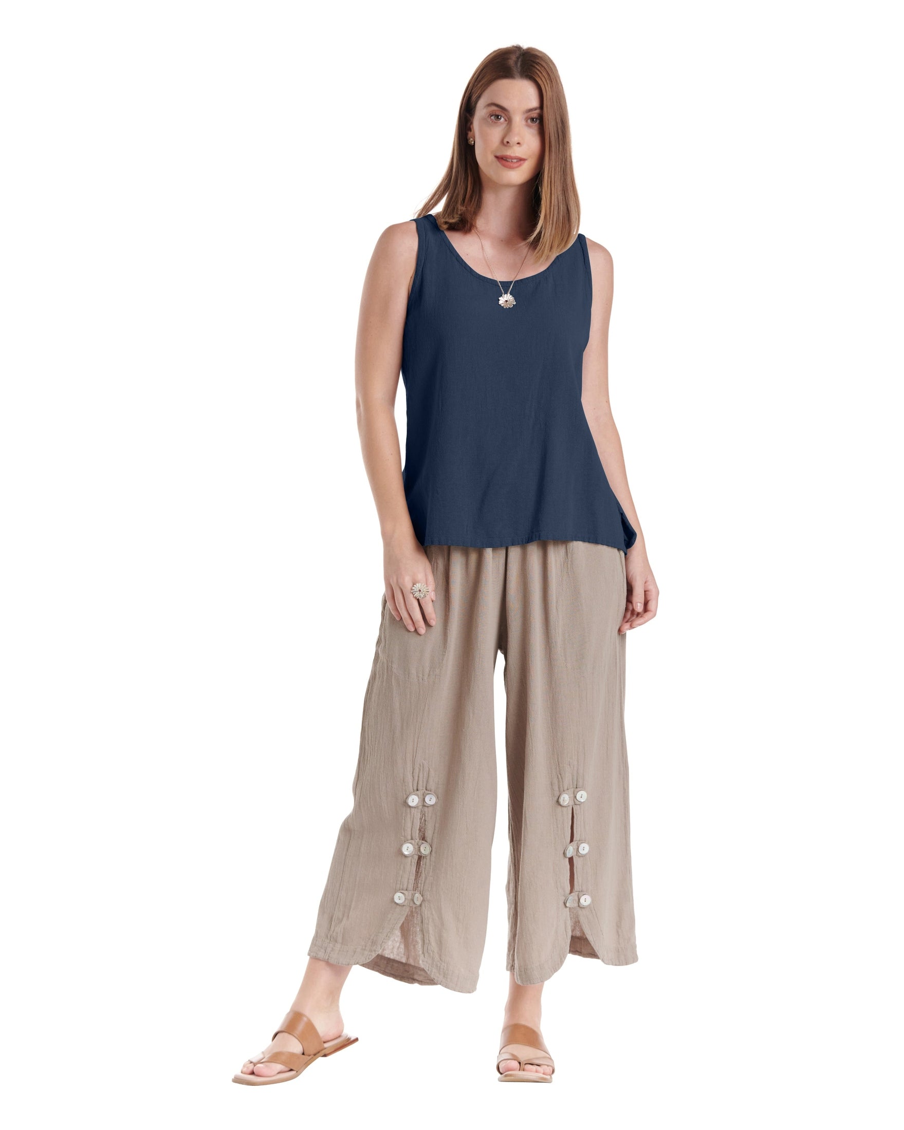 A timeless, sleeveless cotton gauze tank top designed for effortless layering or wearing on its own. Perfect for hot summer days and easygoing, sun-soaked style.