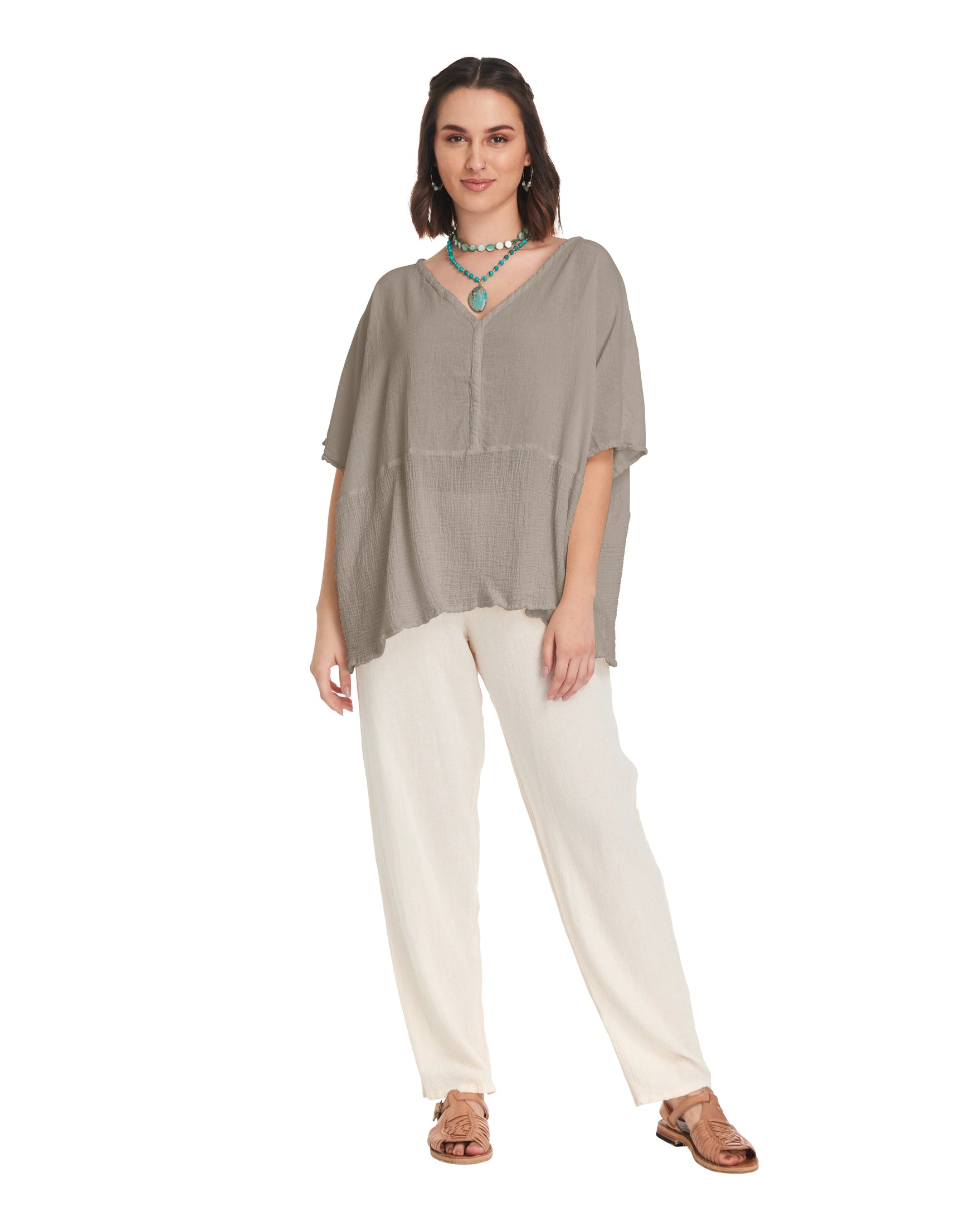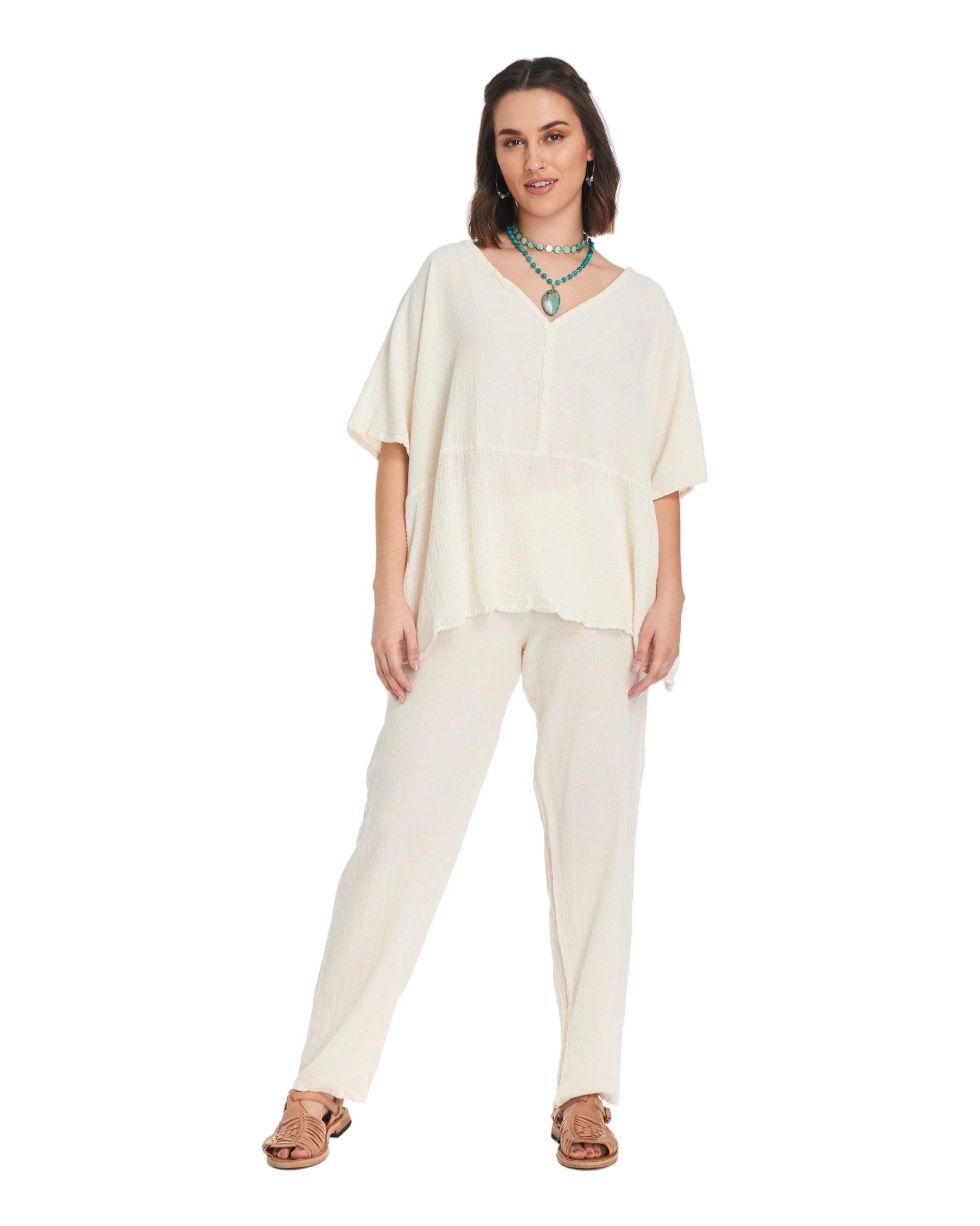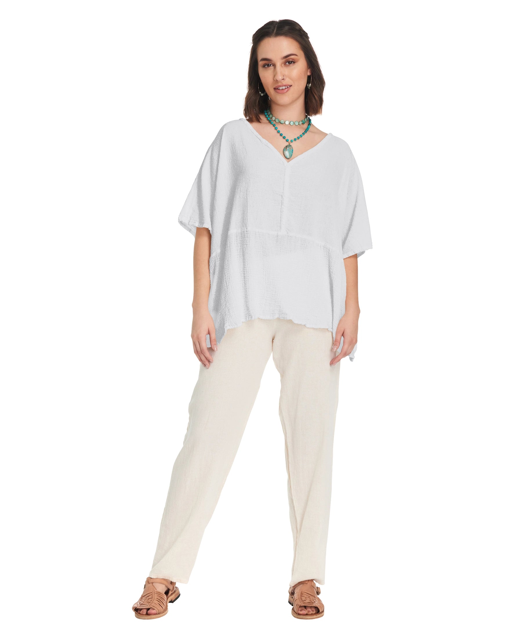 A full boxy-cut cotton gauze top, featuring a lighter-weight cotton fabric on the bottom half for a subtle contrast and breezy feel.