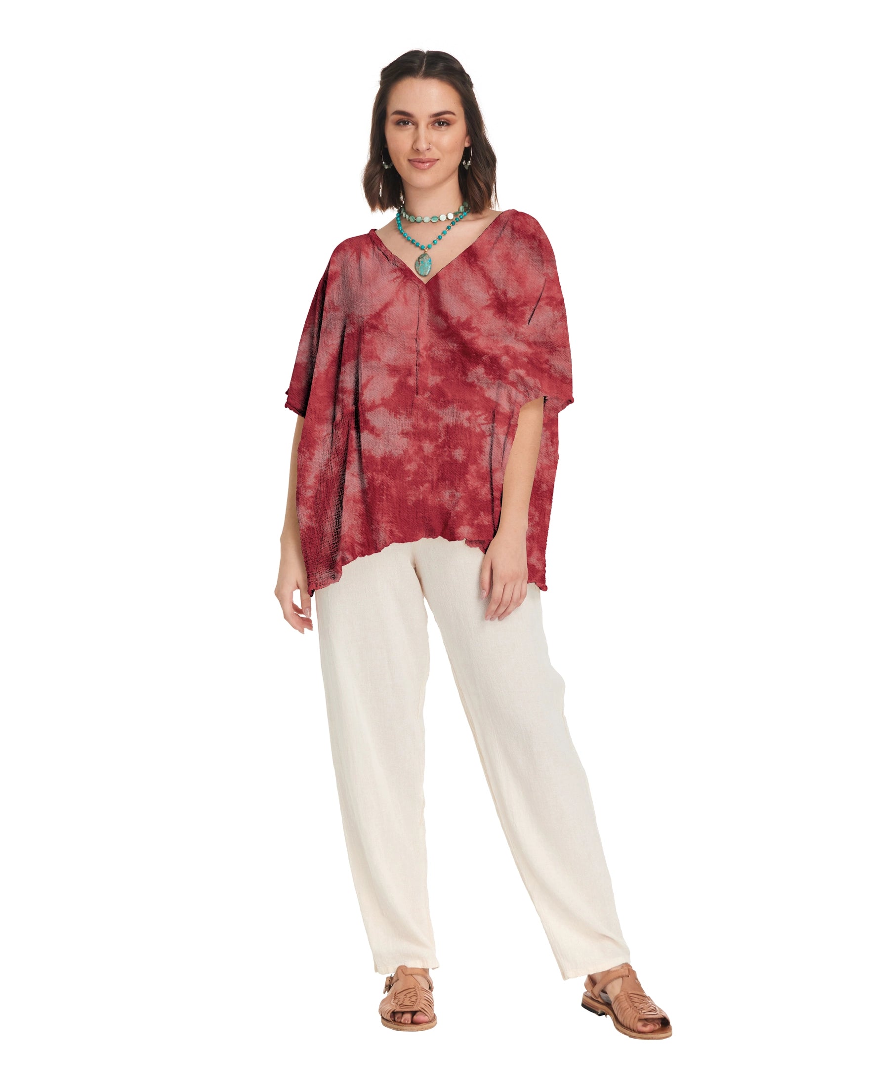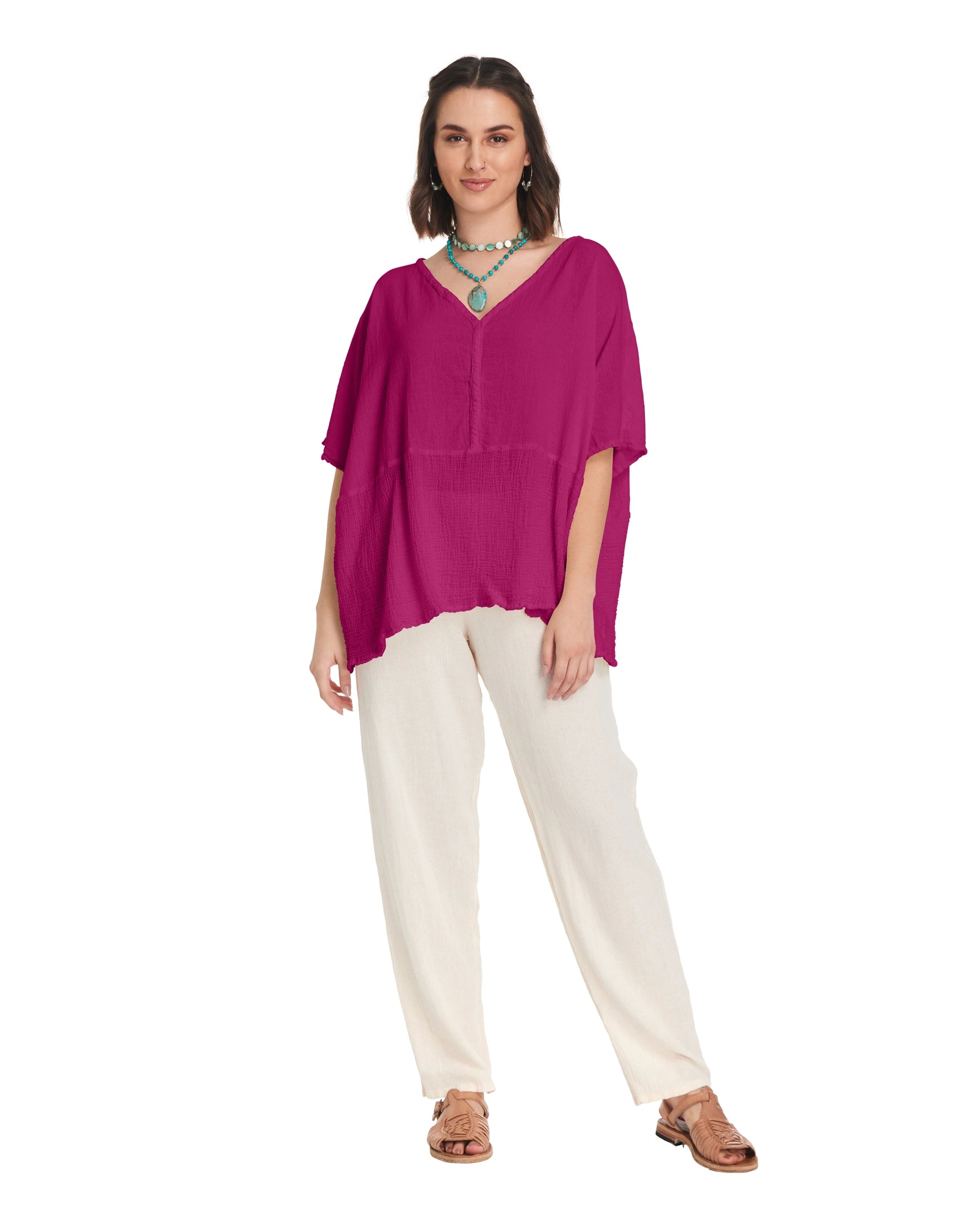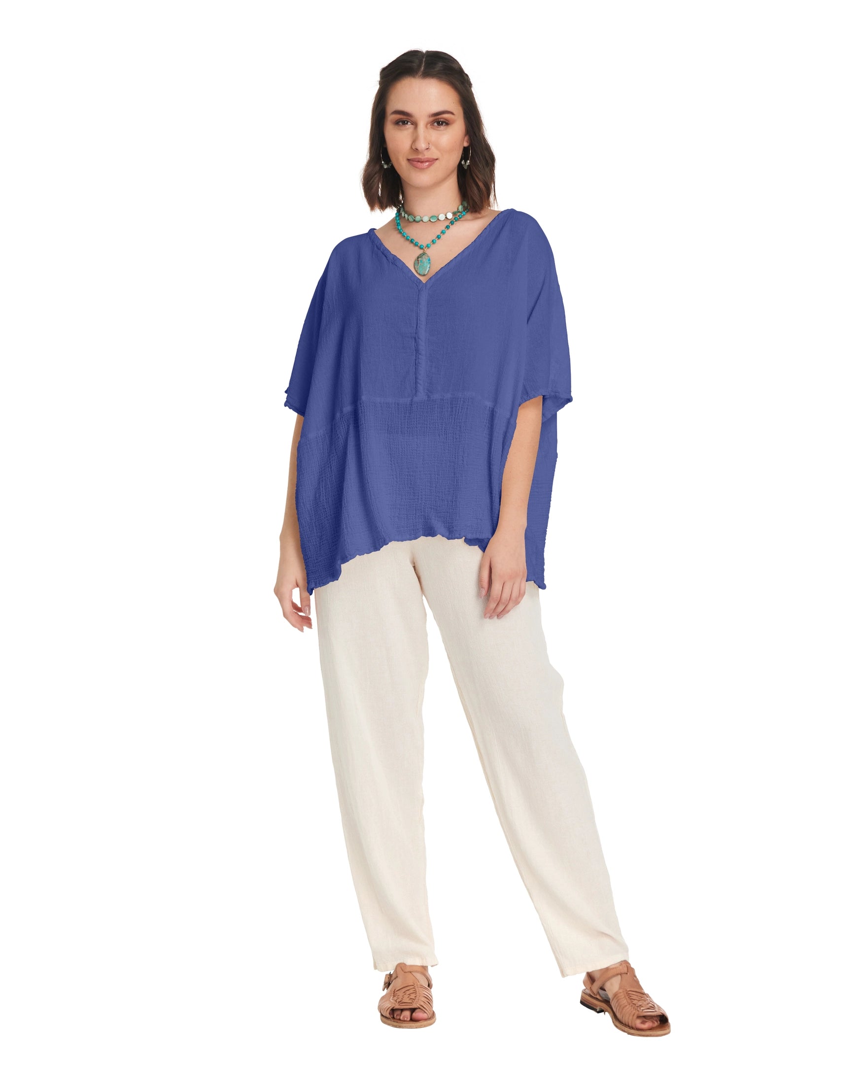 A full boxy-cut cotton gauze top, featuring a lighter-weight cotton fabric on the bottom half for a subtle contrast and breezy feel.