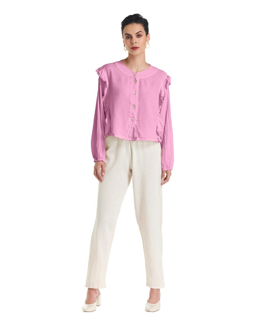 A cotton gauze blouse with a Chinese collar and elegant ruffles on the front and back. The 3/4 sleeves have spring finishes, which add an attractive pleated effect. You can wear it as a versatile piece, whether closed with buttons or open.