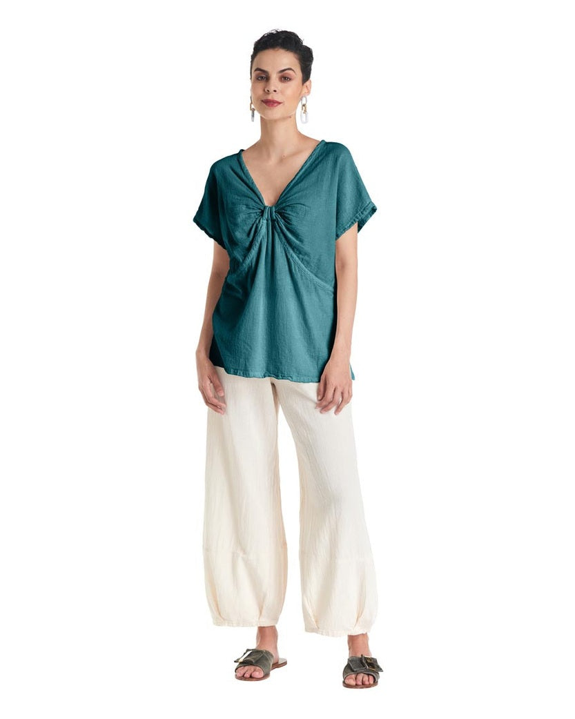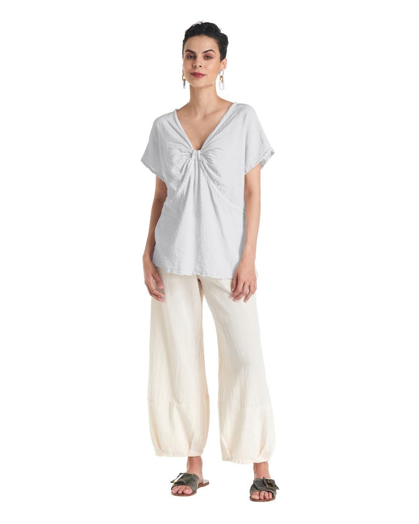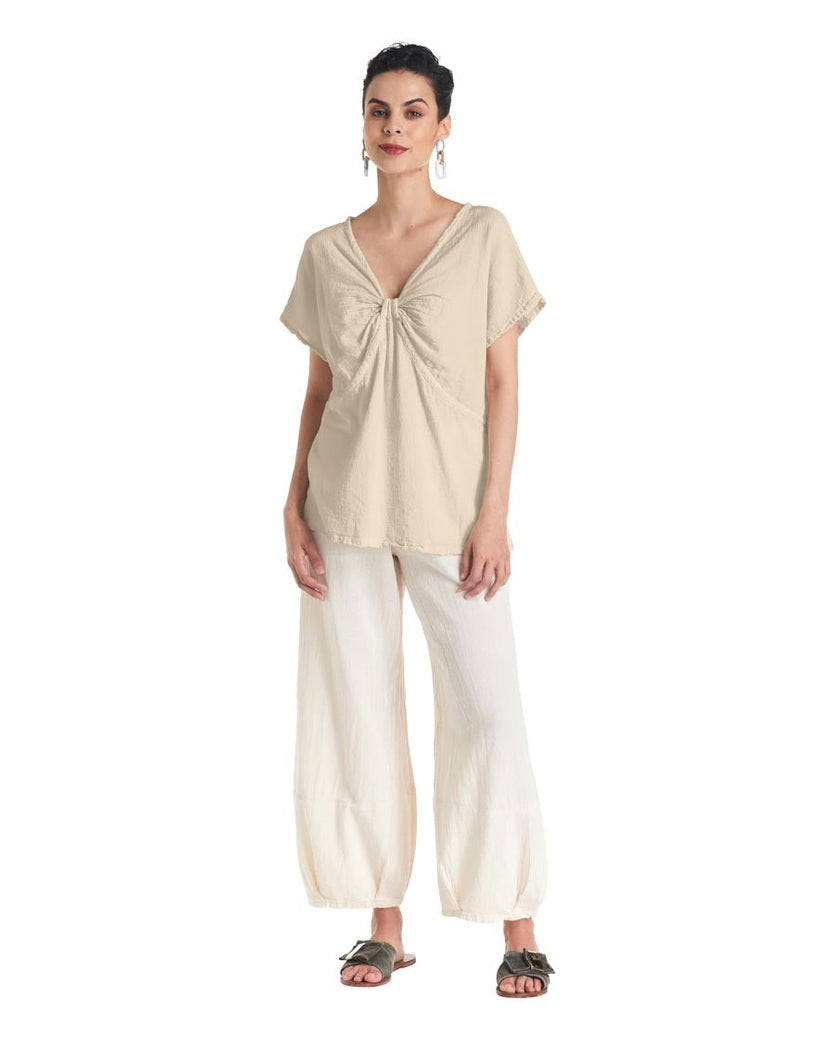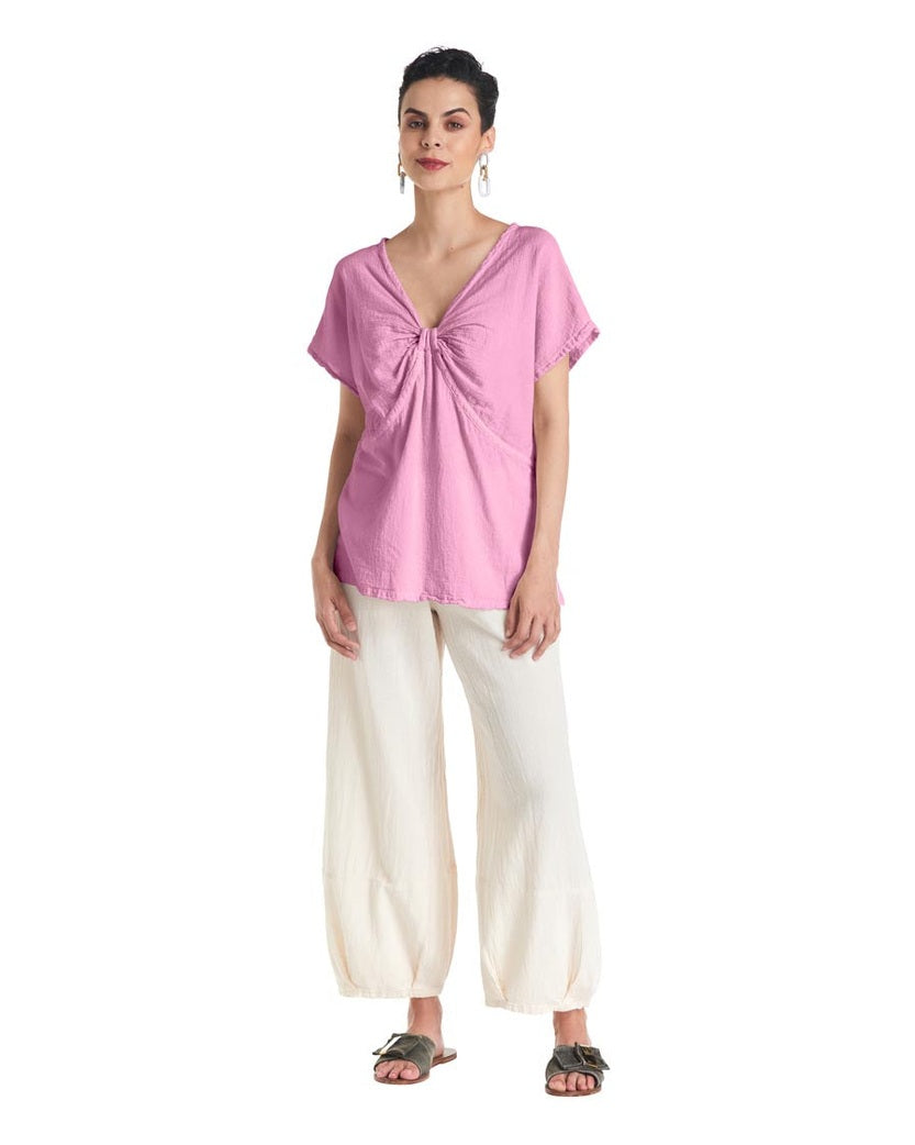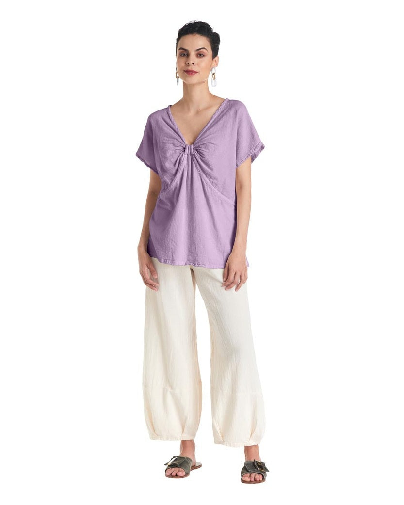 A short sleeve cotton gauze V-neck top with frontal "bow" detail.