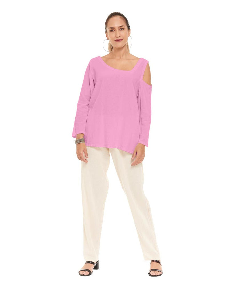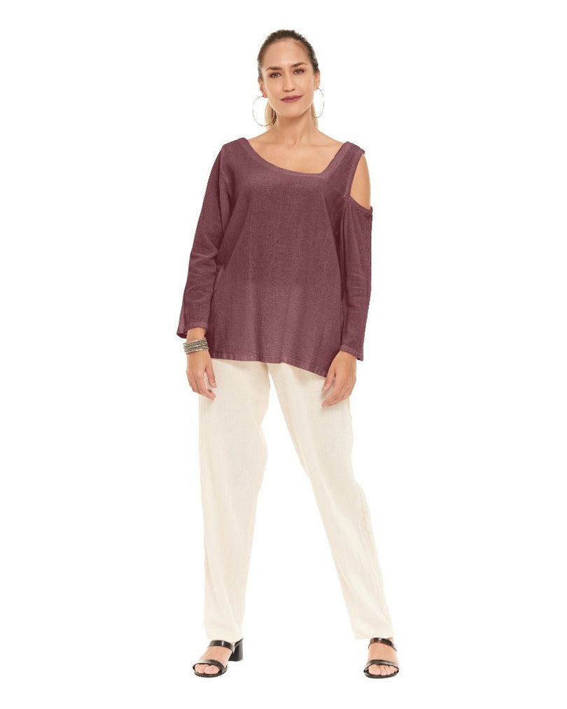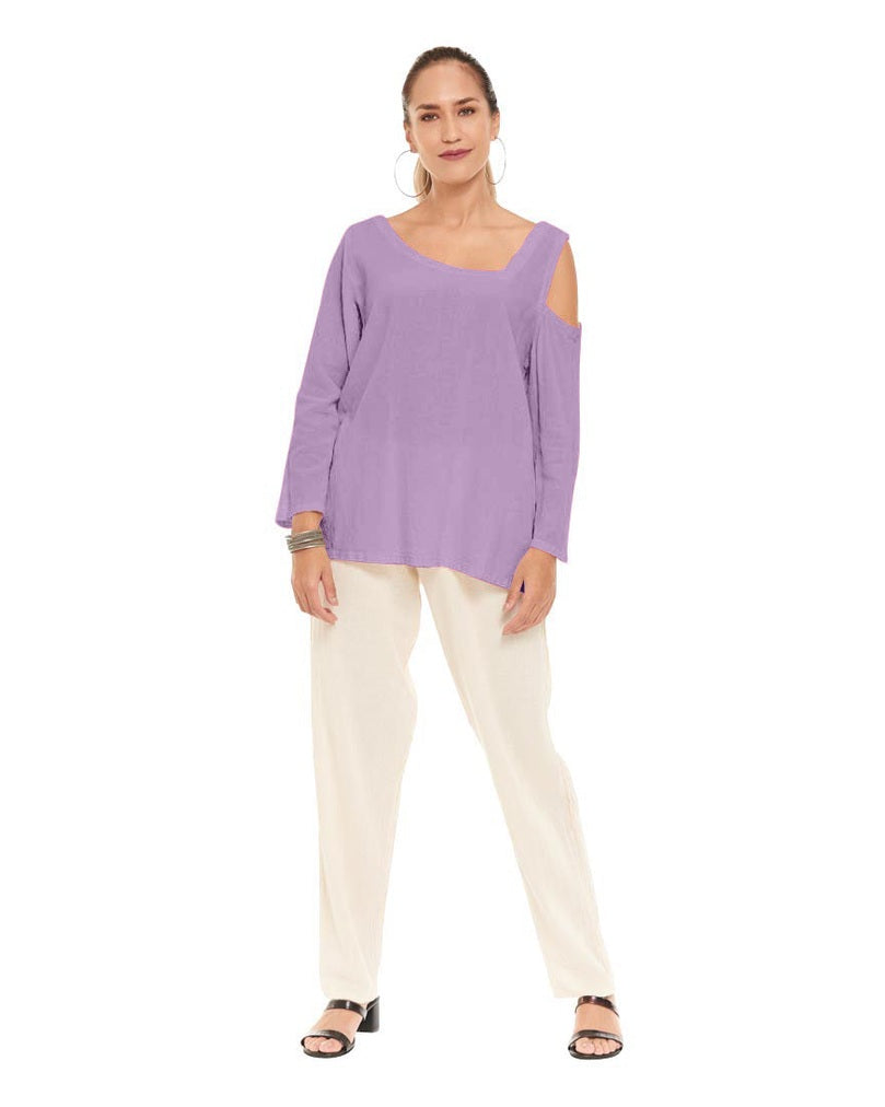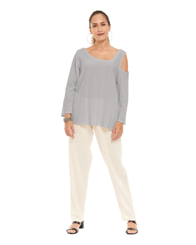 A unconventional cotton gauze top with an open shoulder on one side and slanted neckline.