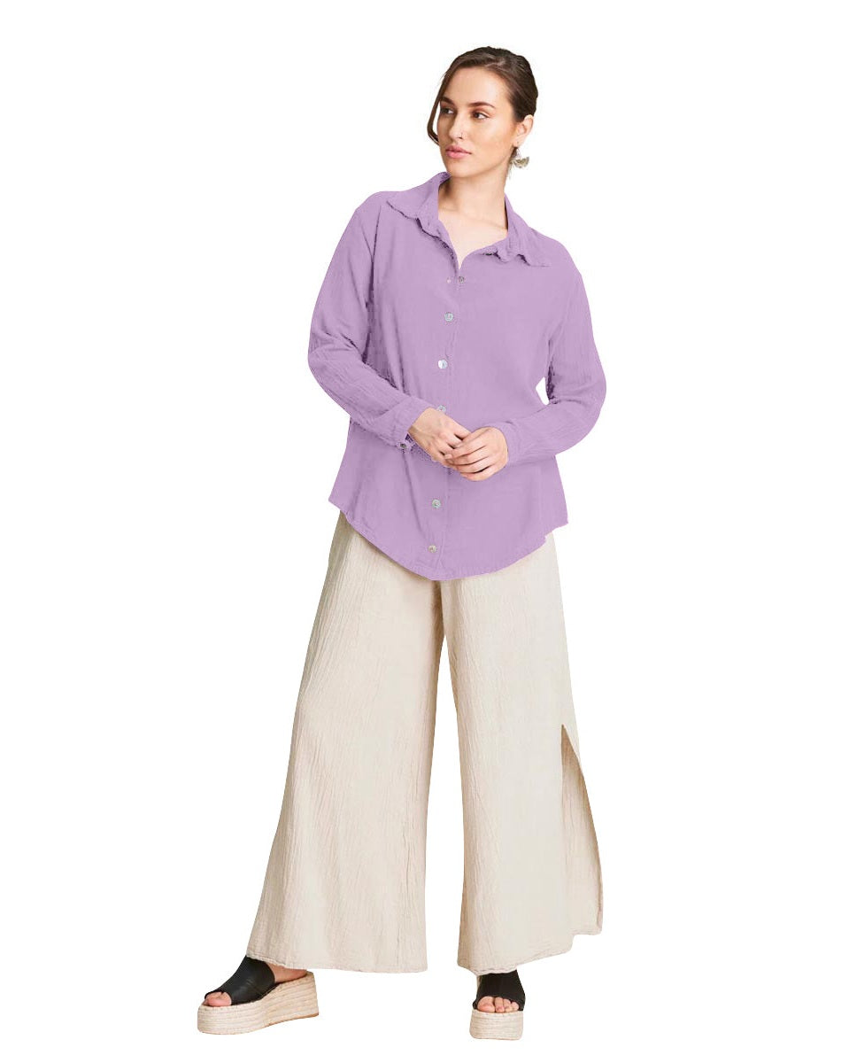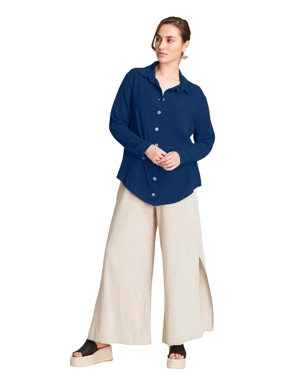 A basic cotton gauze button-down top, with long sleeves and small cuffs that end with a button. This garment is ideal for the female figure, it can be worn closed or open.