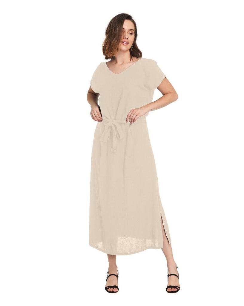 A longer cotton gauze dress with cap sleeves, attached belt for tying in front or back, and smaller V-back detail.