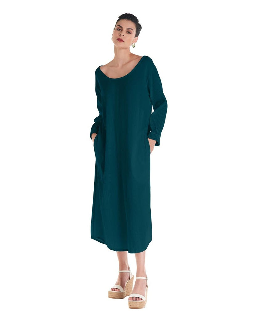 A mid-length cotton gauze dress with pockets, jewel neckline, and elastic sleeve cuffs.
