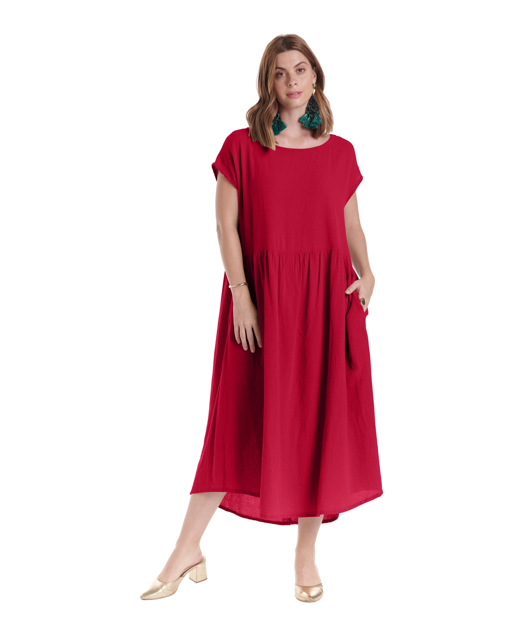 A cotton gauze dress, capped sleeve with a round neckline, with hidden pockets, the skirt is pleated creating a beautiful vaporous effect.