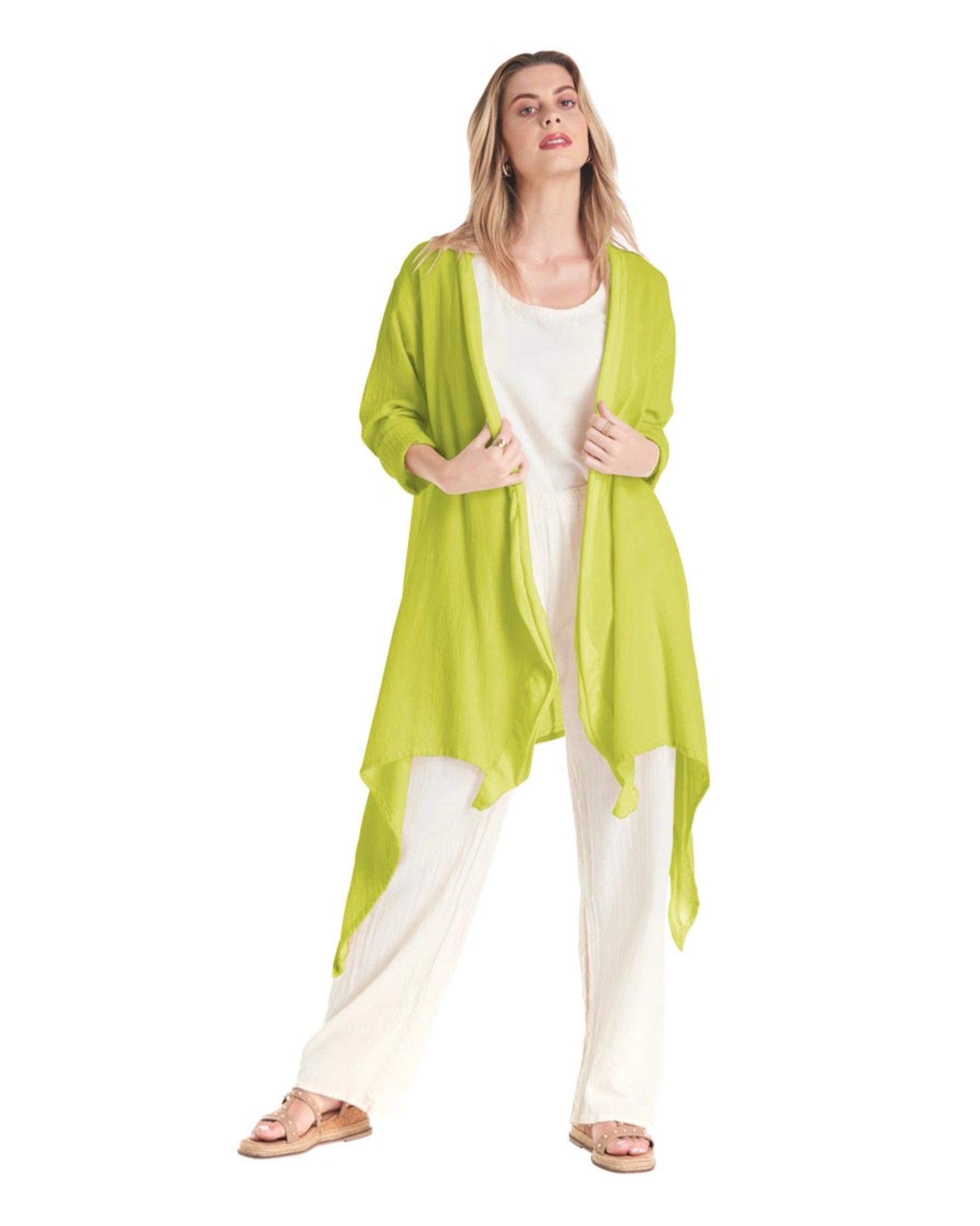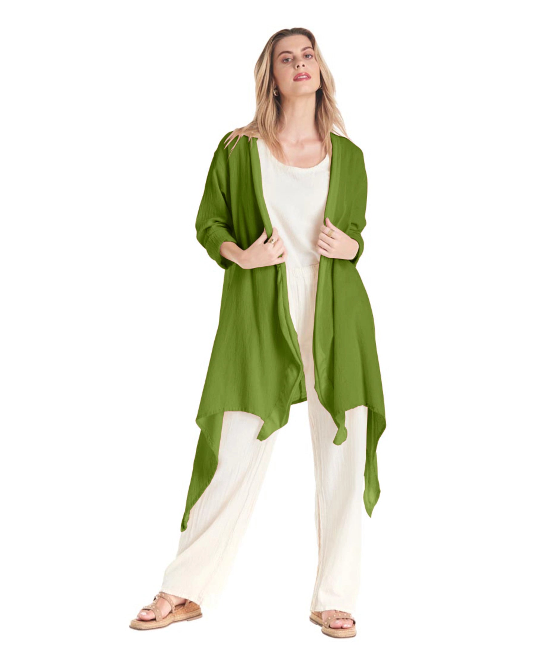 A symmetrical cotton gauze jacket with pockets. The collar and lapel are made from a smooth material to enhance the appearance.