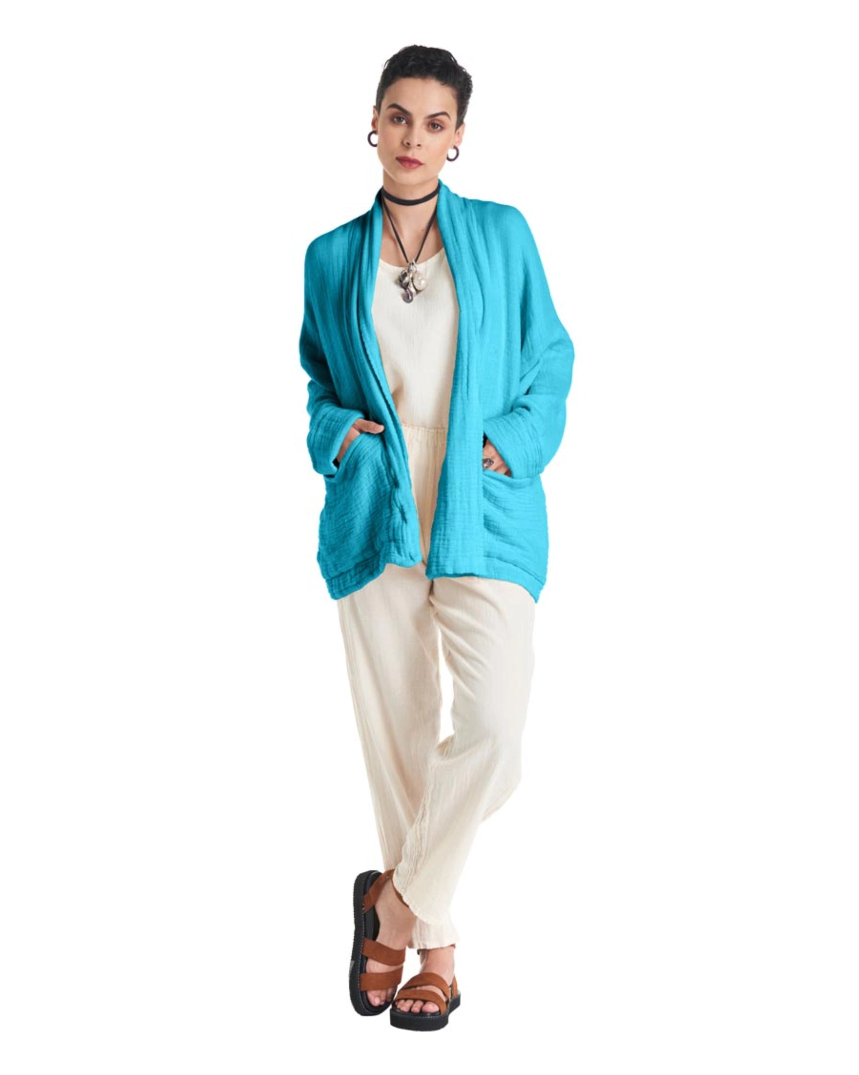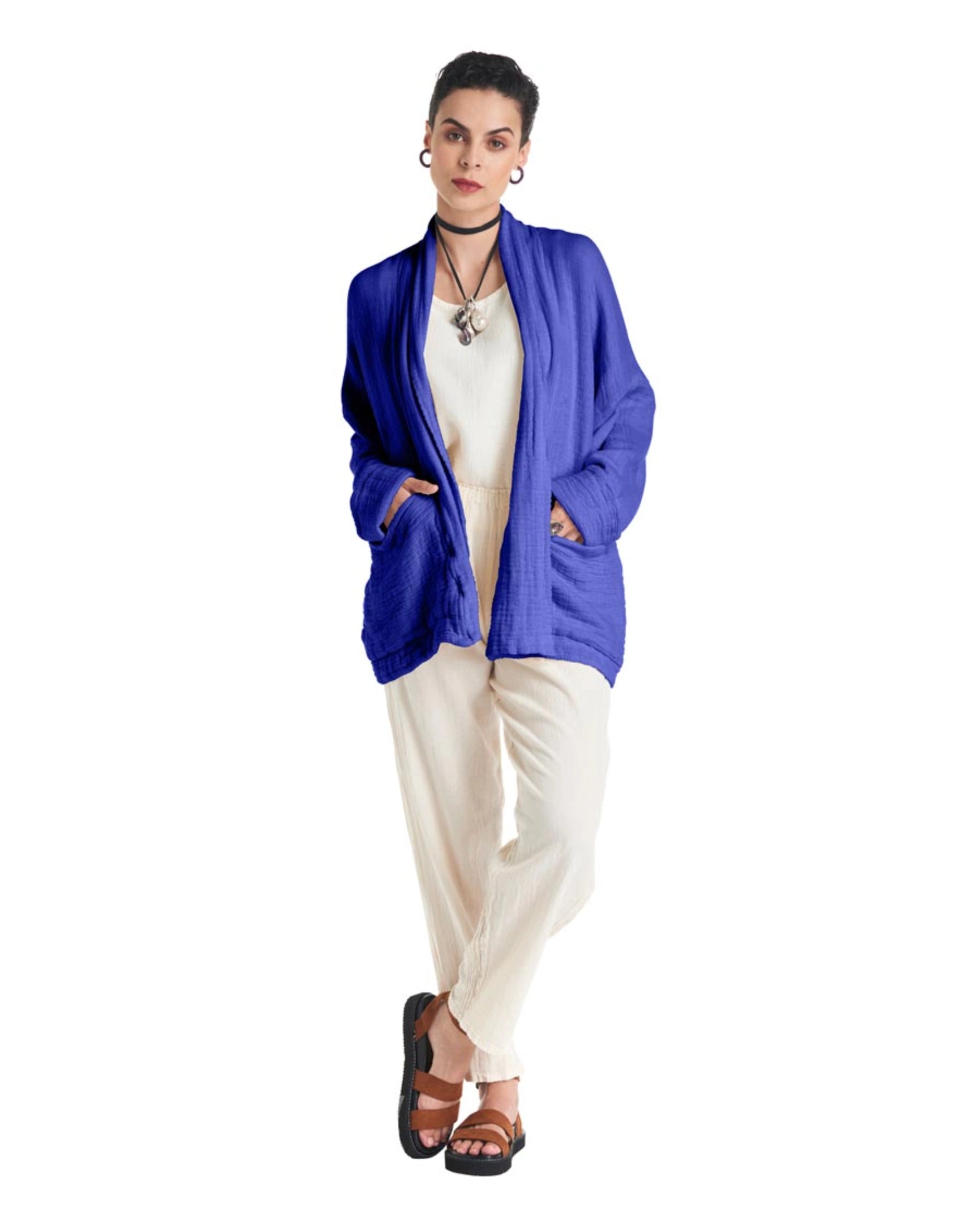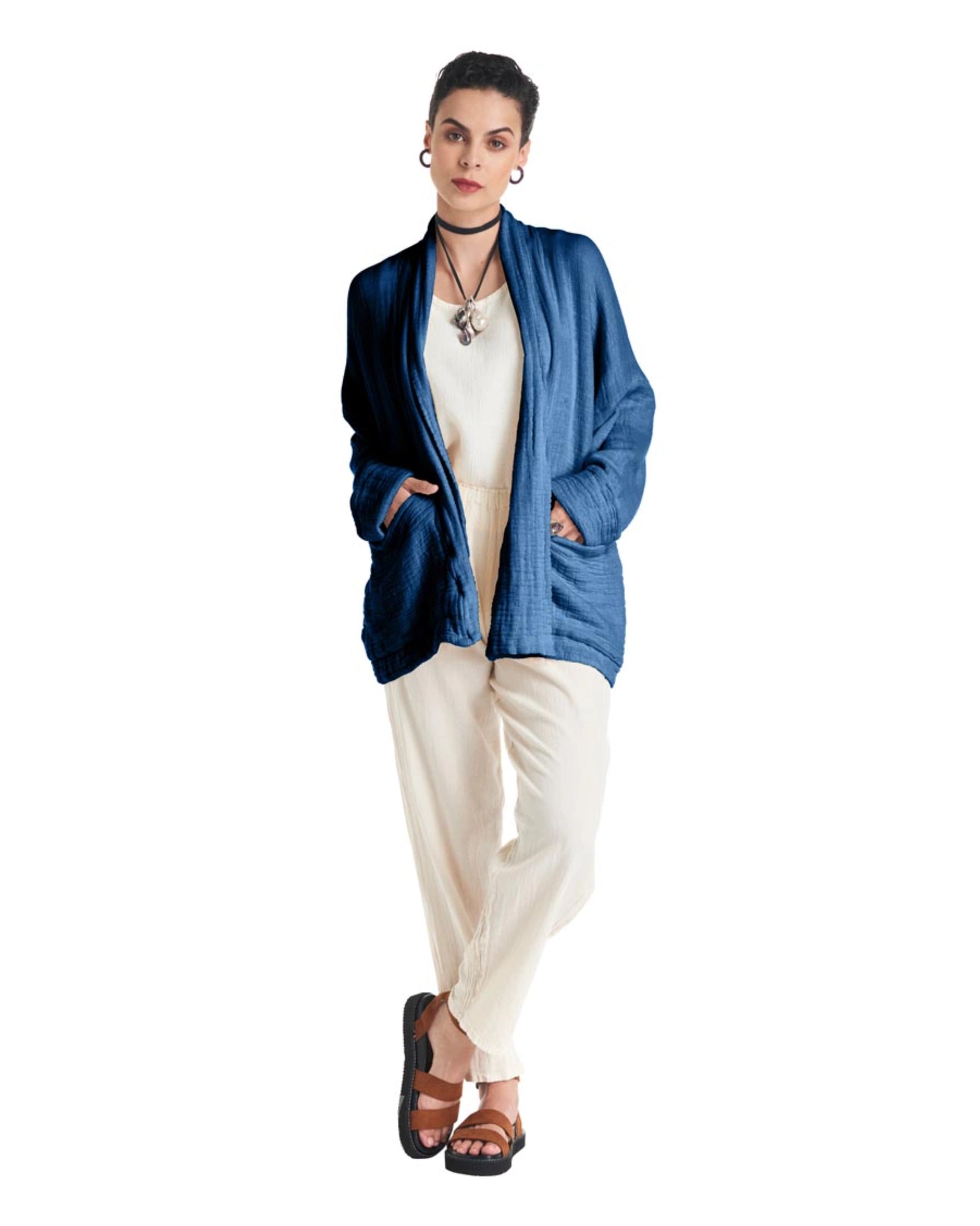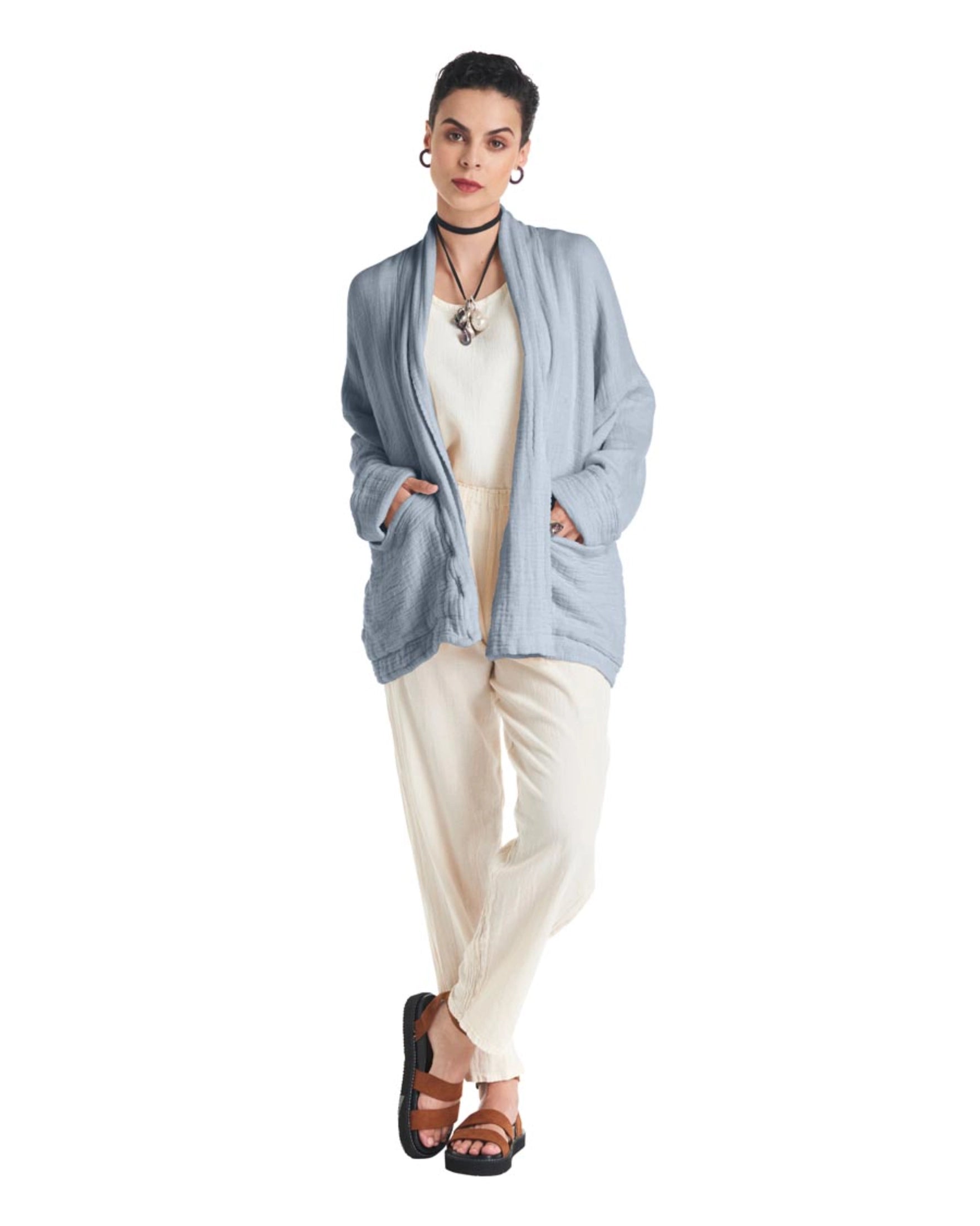 A cotton gauze jacket made with two layers of fabric, this elegant jacket stands out for its practical patch pockets and a sophisticated flap. Ideal for those moments of transition between seasons.