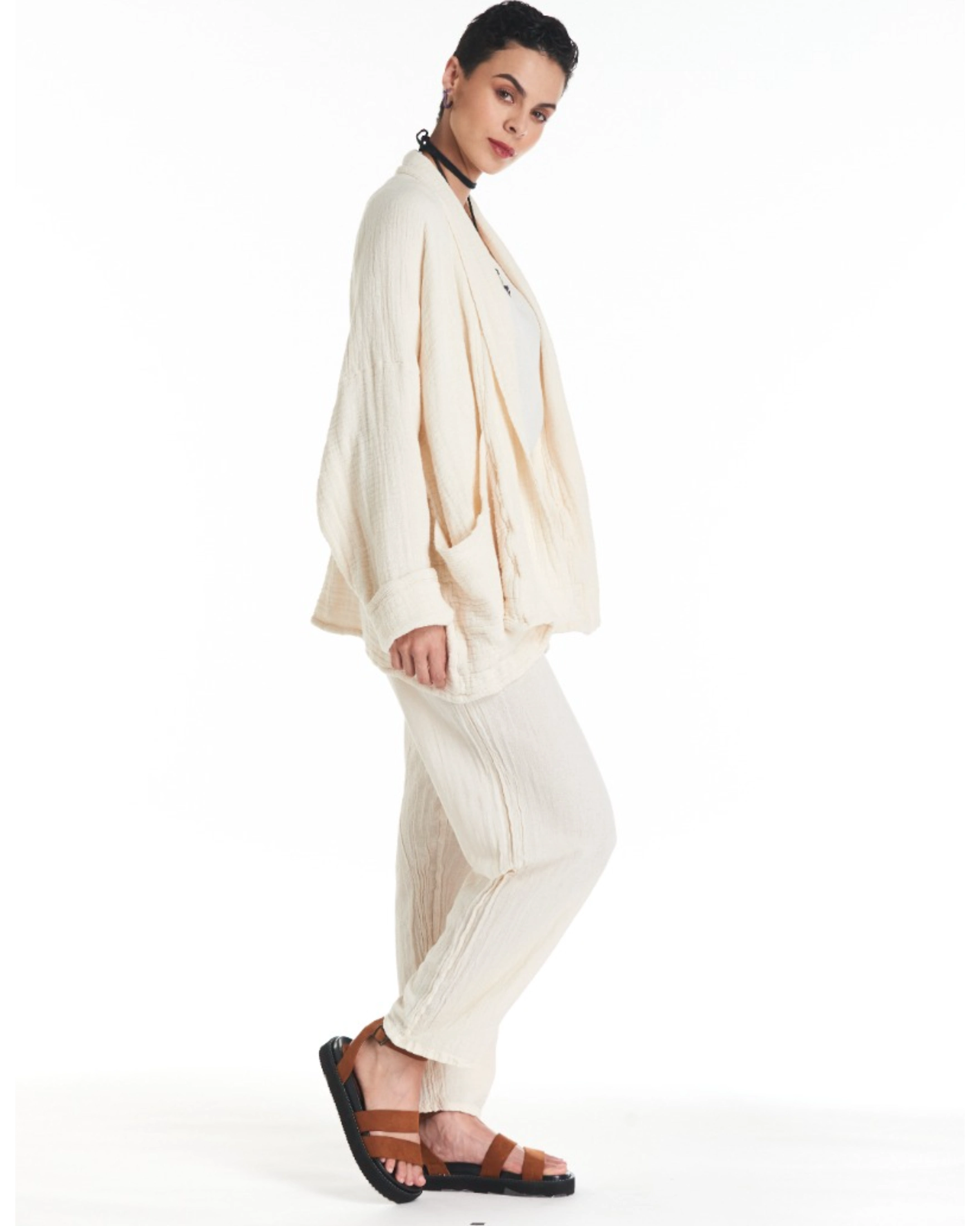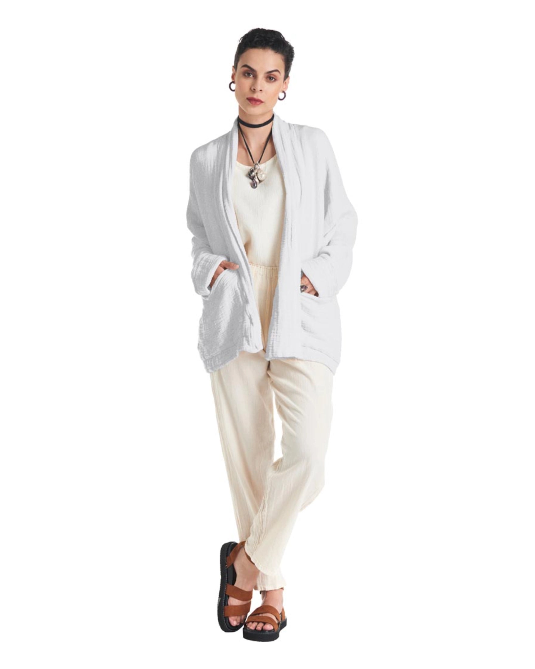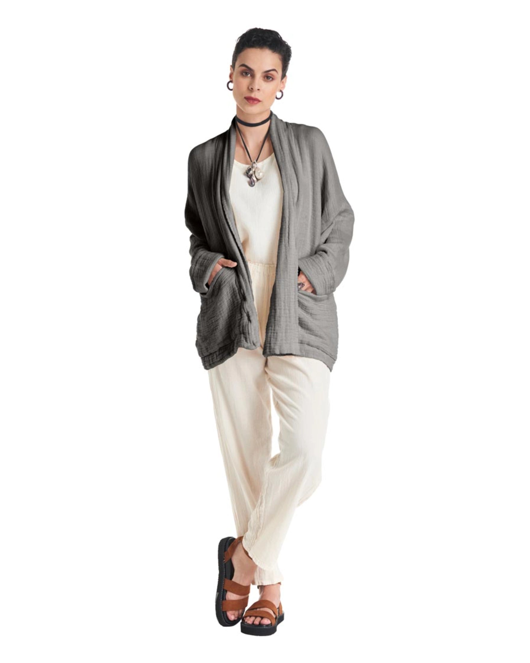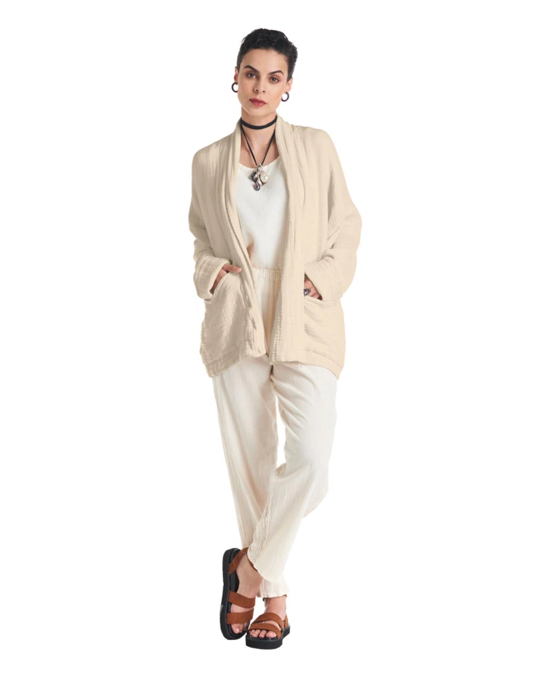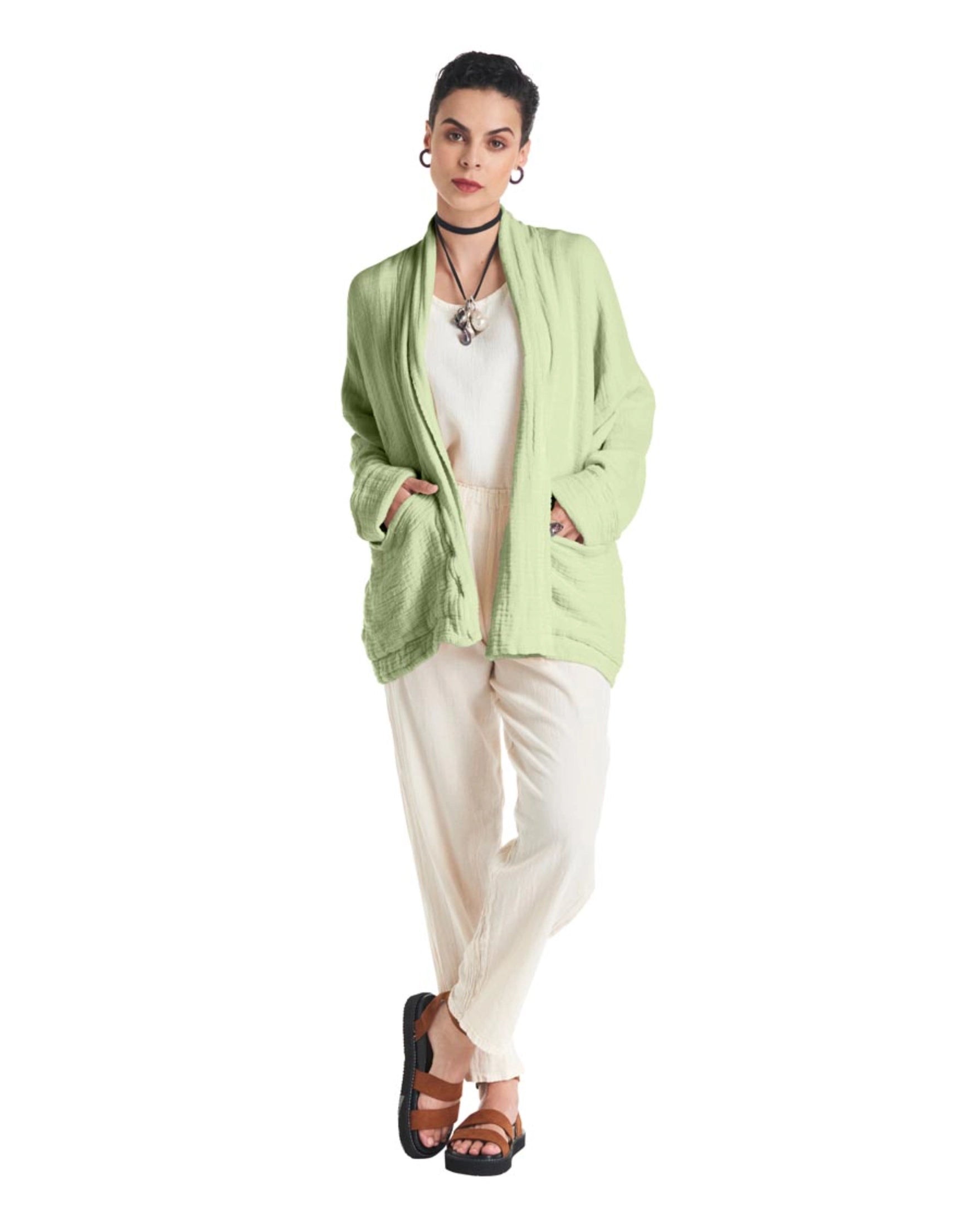 A cotton gauze jacket made with two layers of fabric, this elegant jacket stands out for its practical patch pockets and a sophisticated flap. Ideal for those moments of transition between seasons.