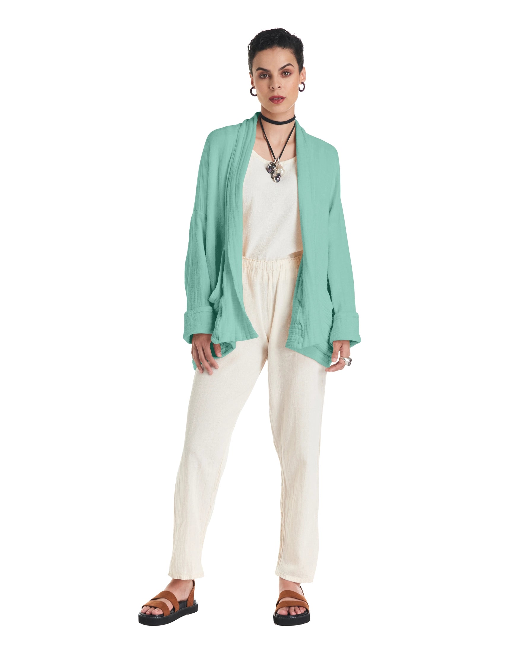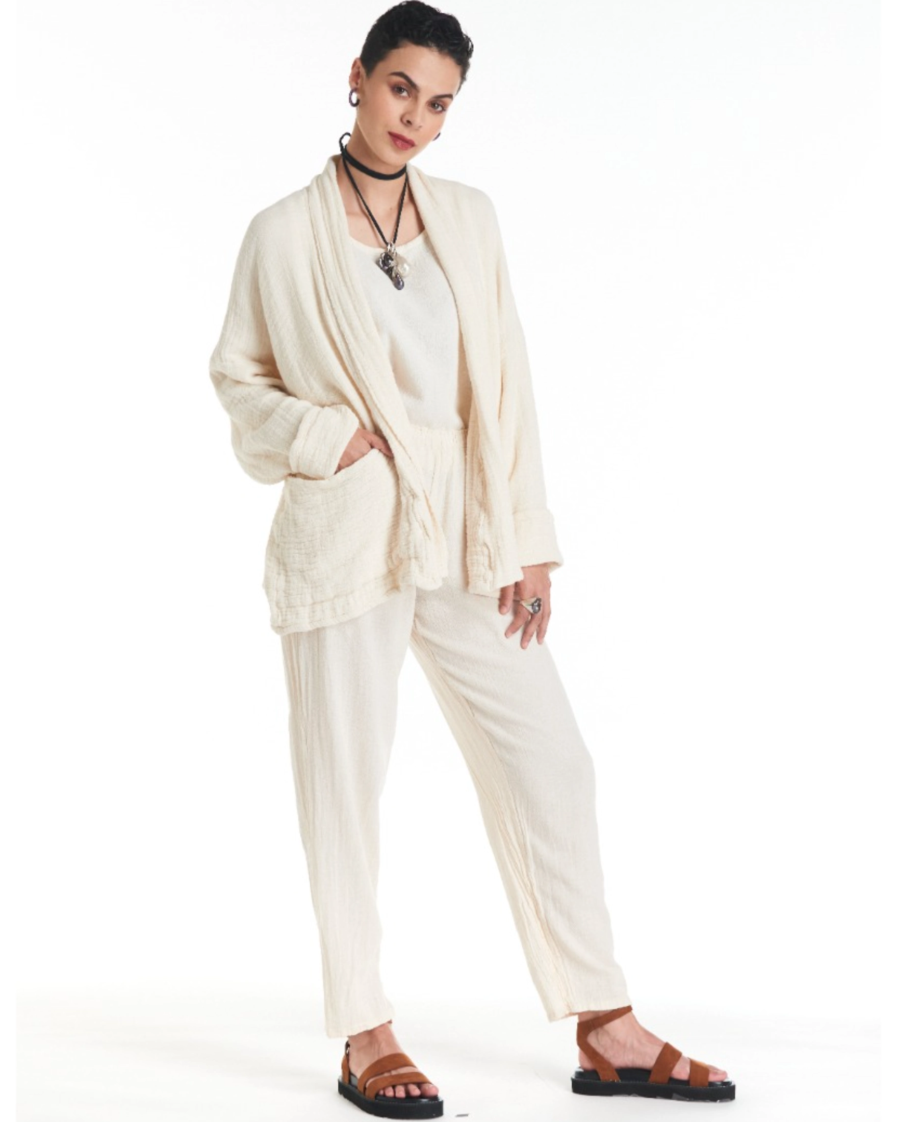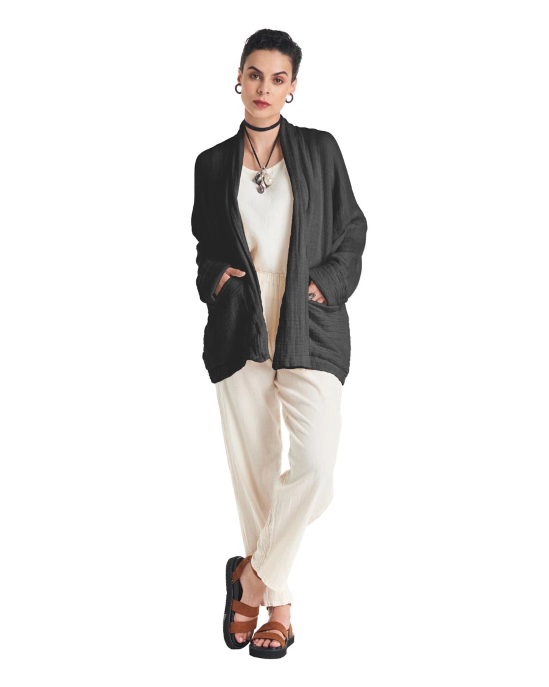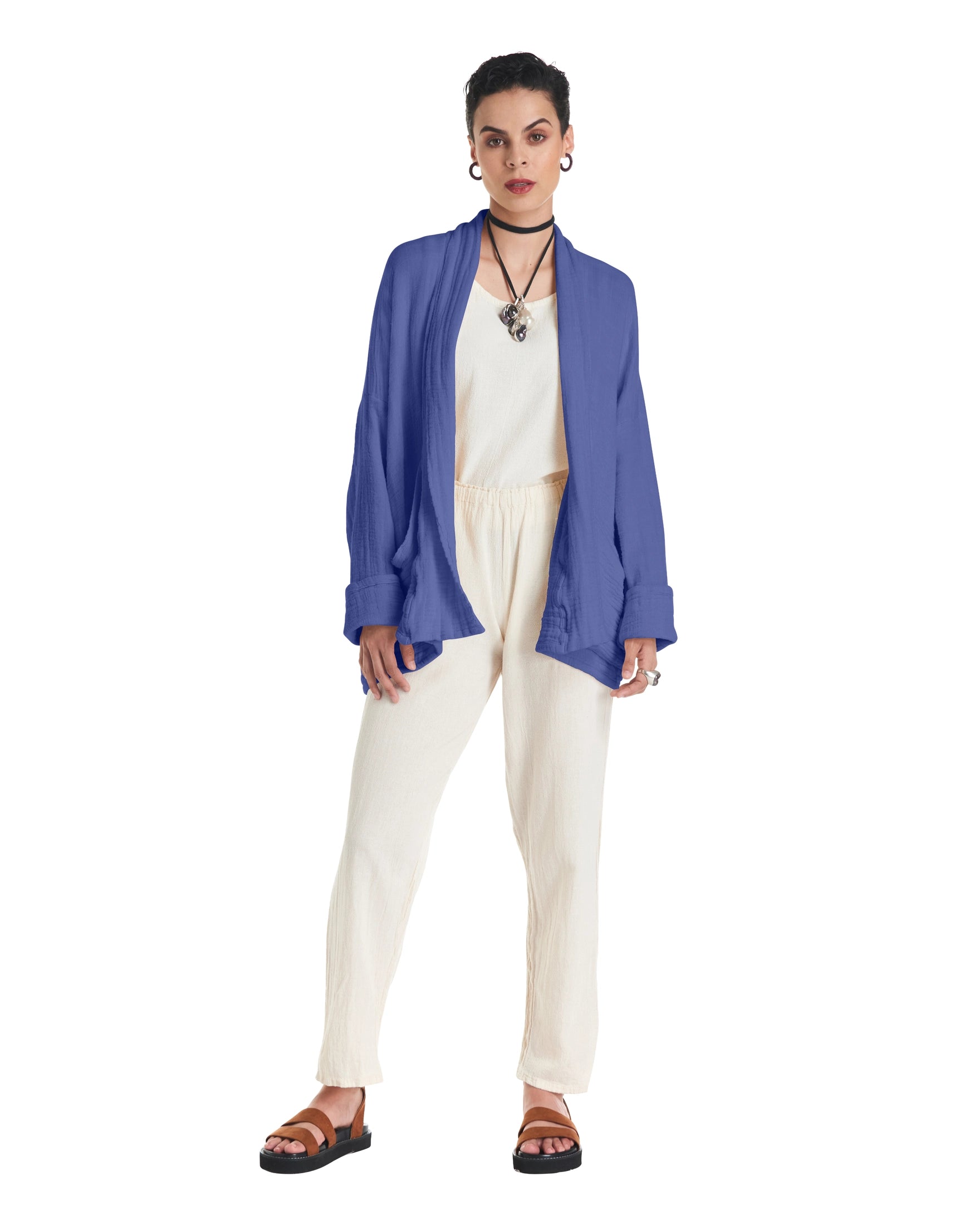 A cotton gauze jacket made with two layers of fabric, this elegant jacket stands out for its practical patch pockets and a sophisticated flap. Ideal for those moments of transition between seasons.
