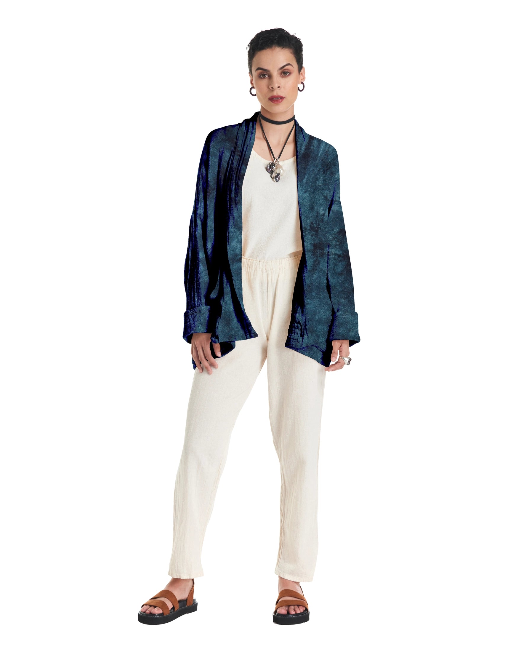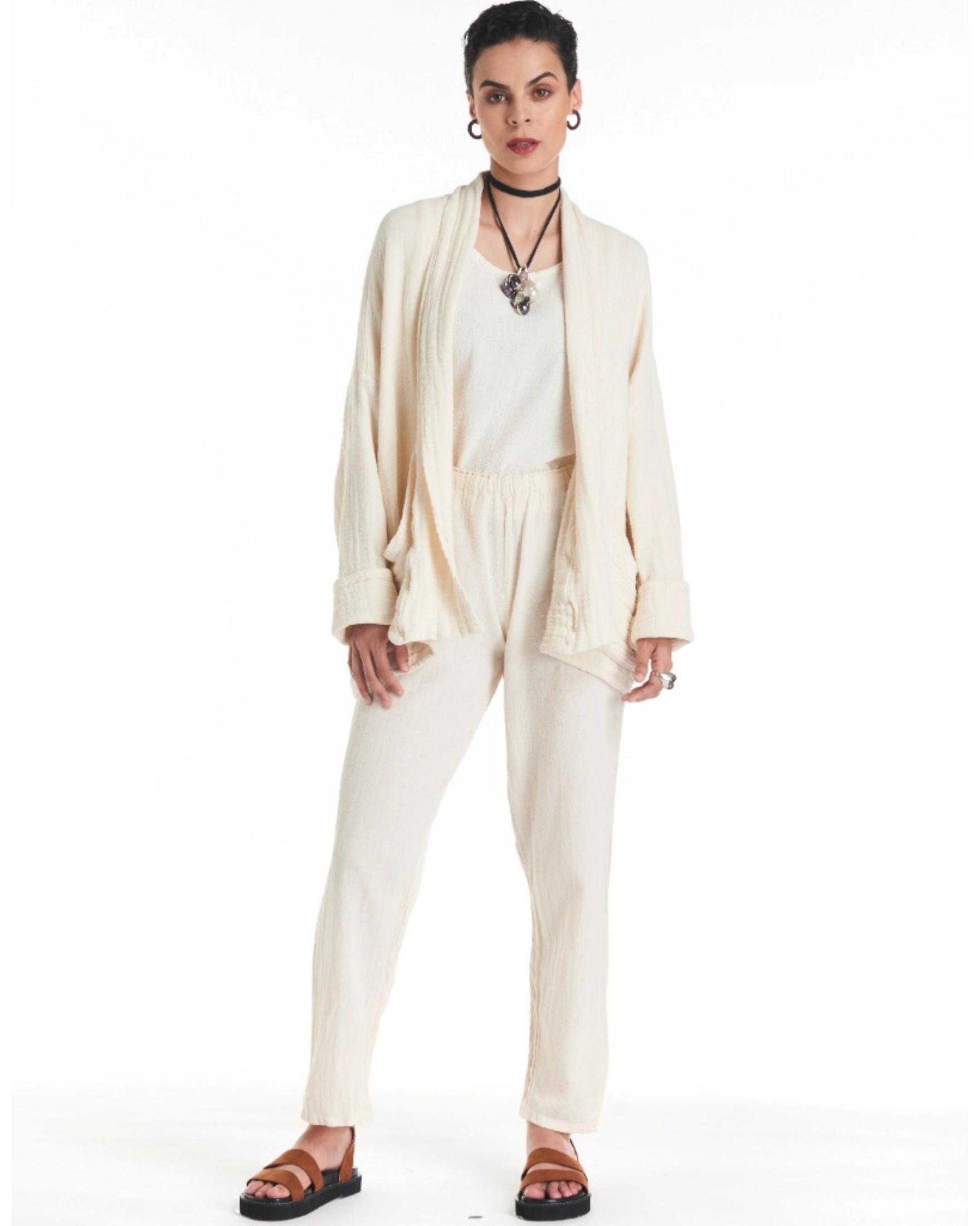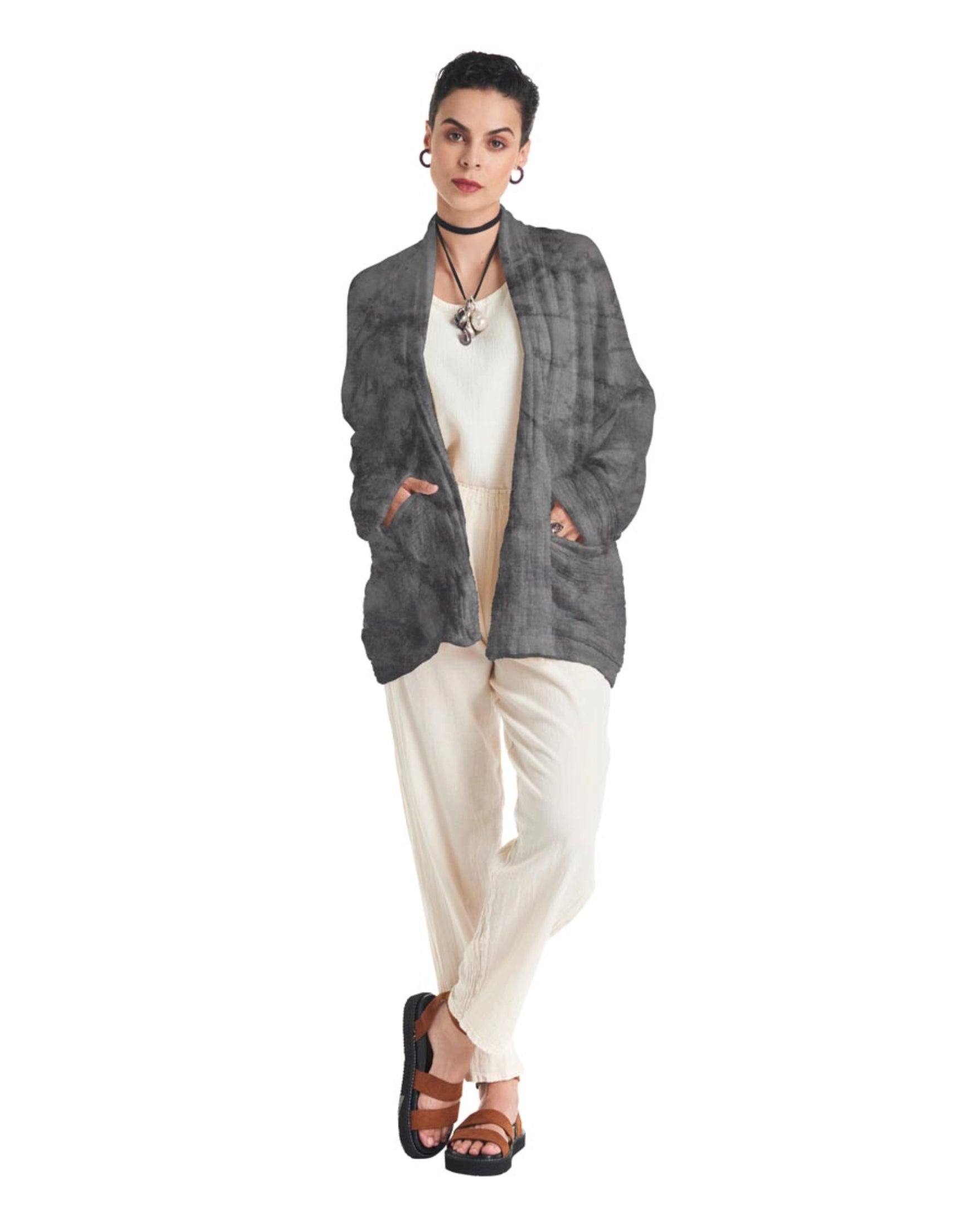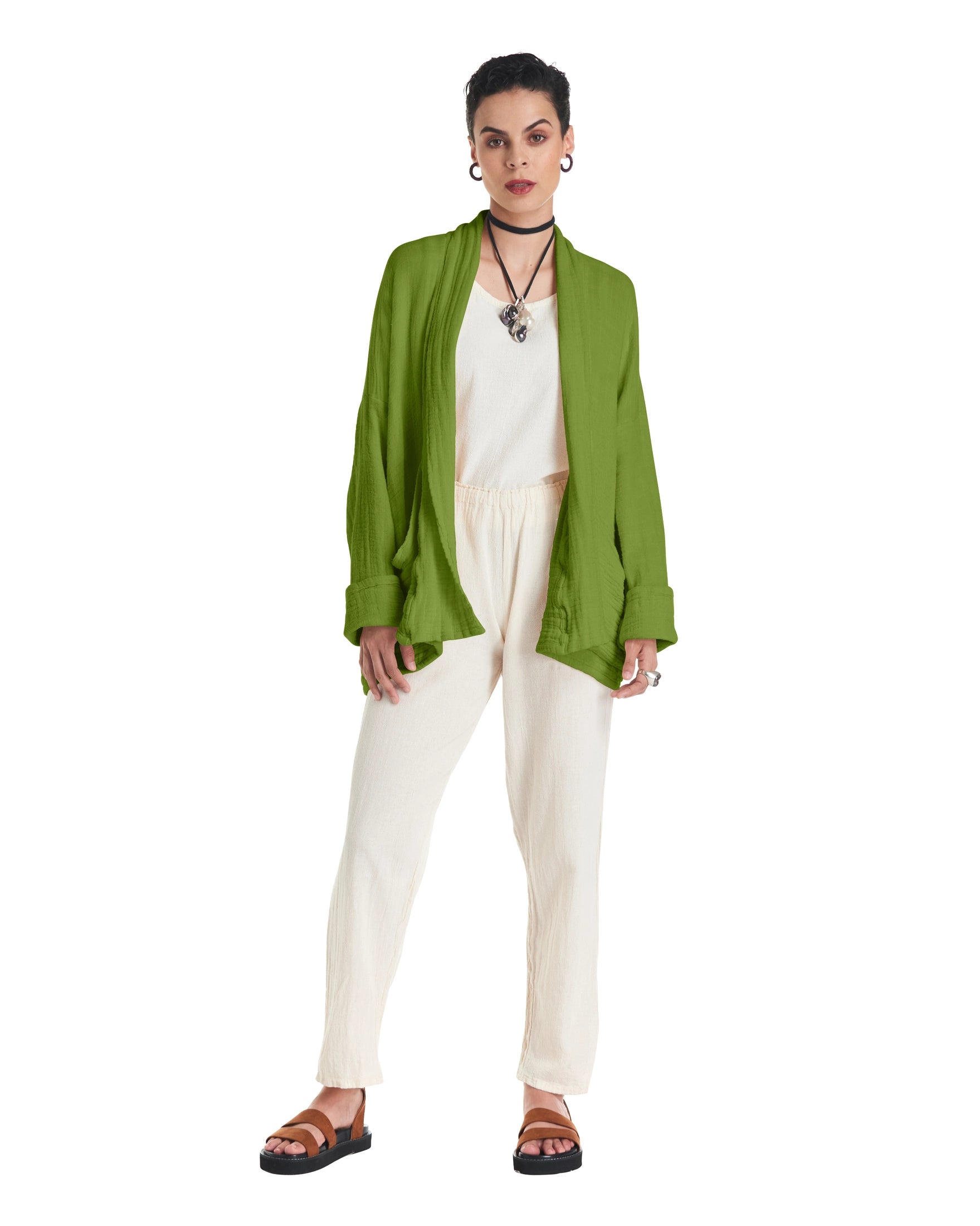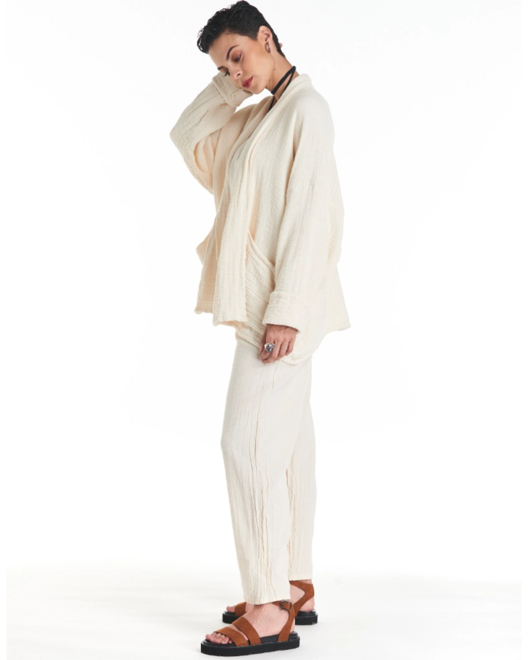 A cotton gauze jacket made with two layers of fabric, this elegant jacket stands out for its practical patch pockets and a sophisticated flap. Ideal for those moments of transition between seasons.