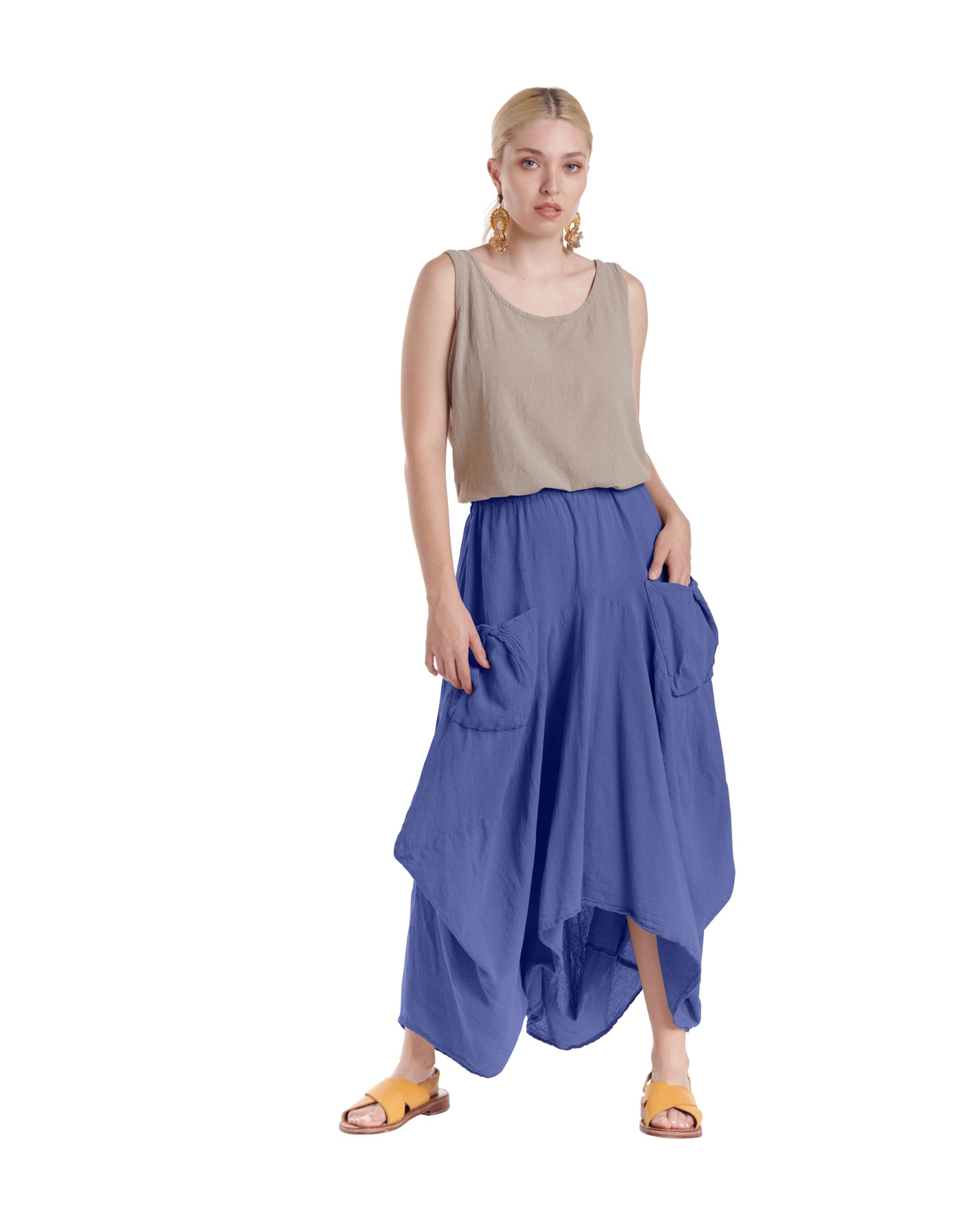 A cotton gauze skirt that boasts a beautiful gathered design that creates a flattering textured look with graceful movement, and pockets add a functional twist to this chic piece.