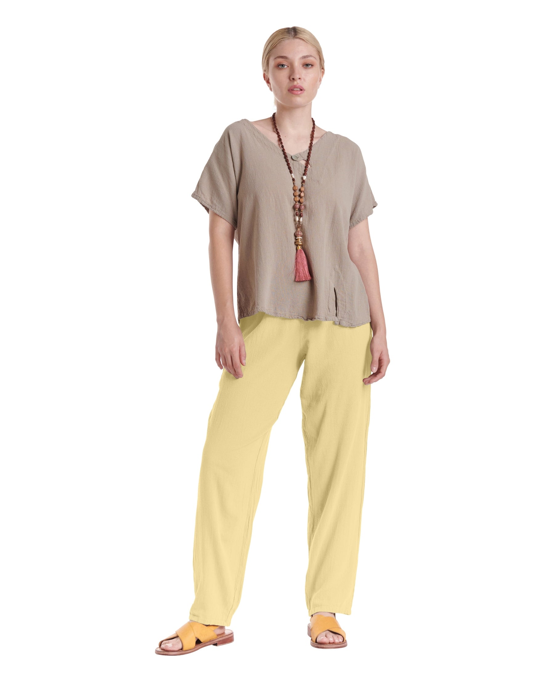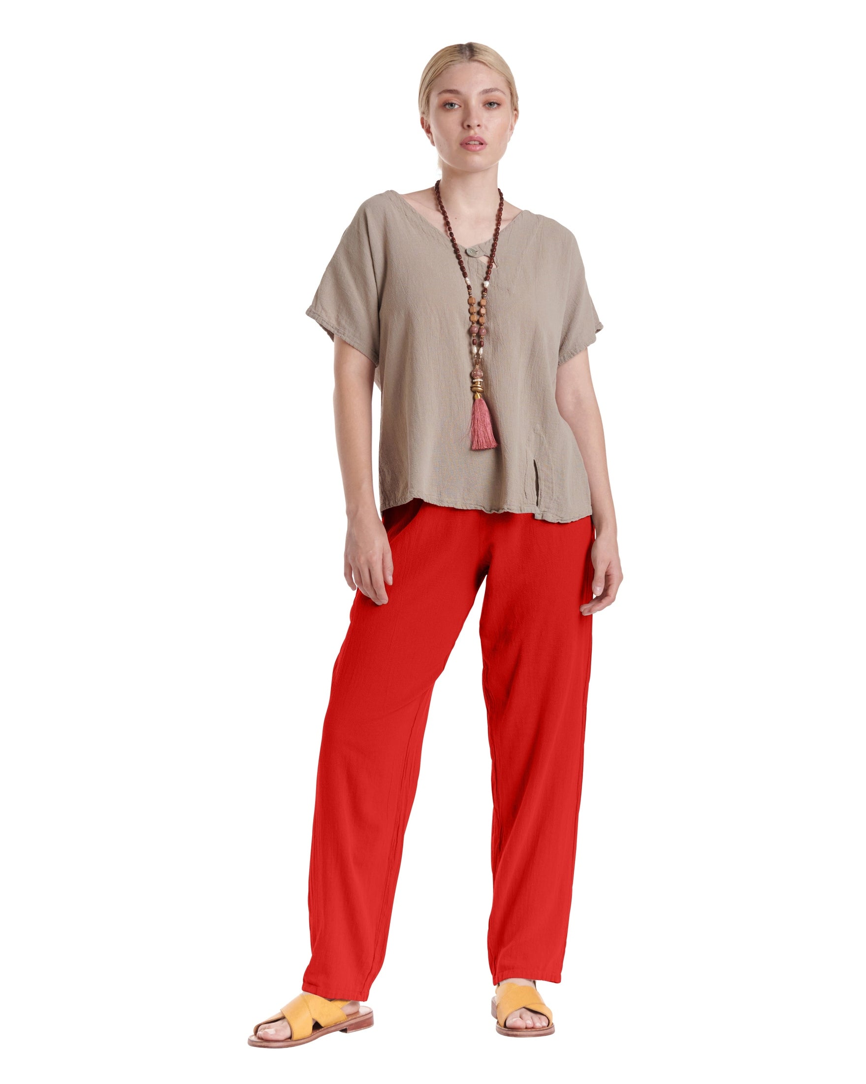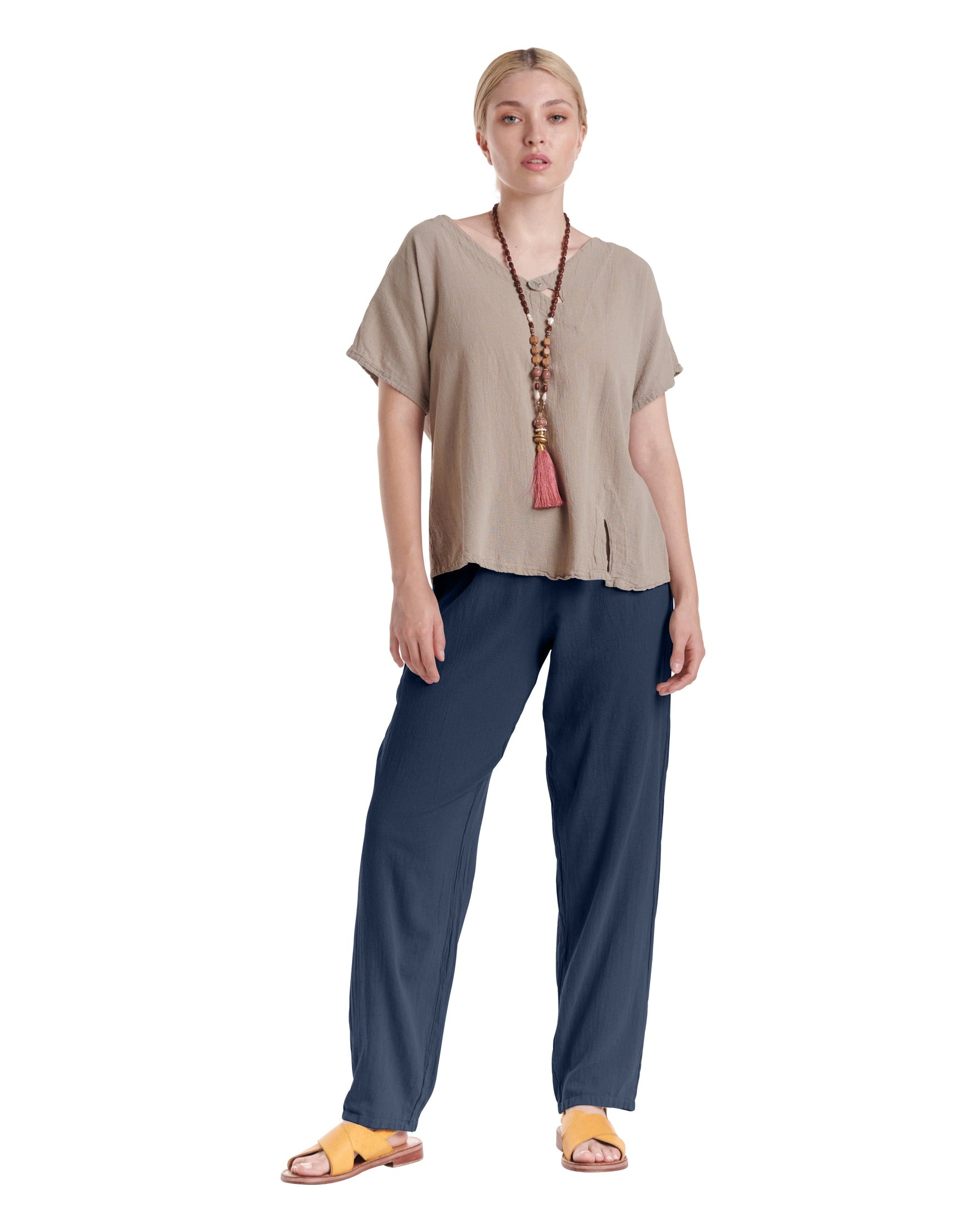 A simple cotton gauze pant with a subtly tapered leg that flatters your figure while adding a modern touch, making these pants effortlessly versatile for dressing up or down on any occasion.