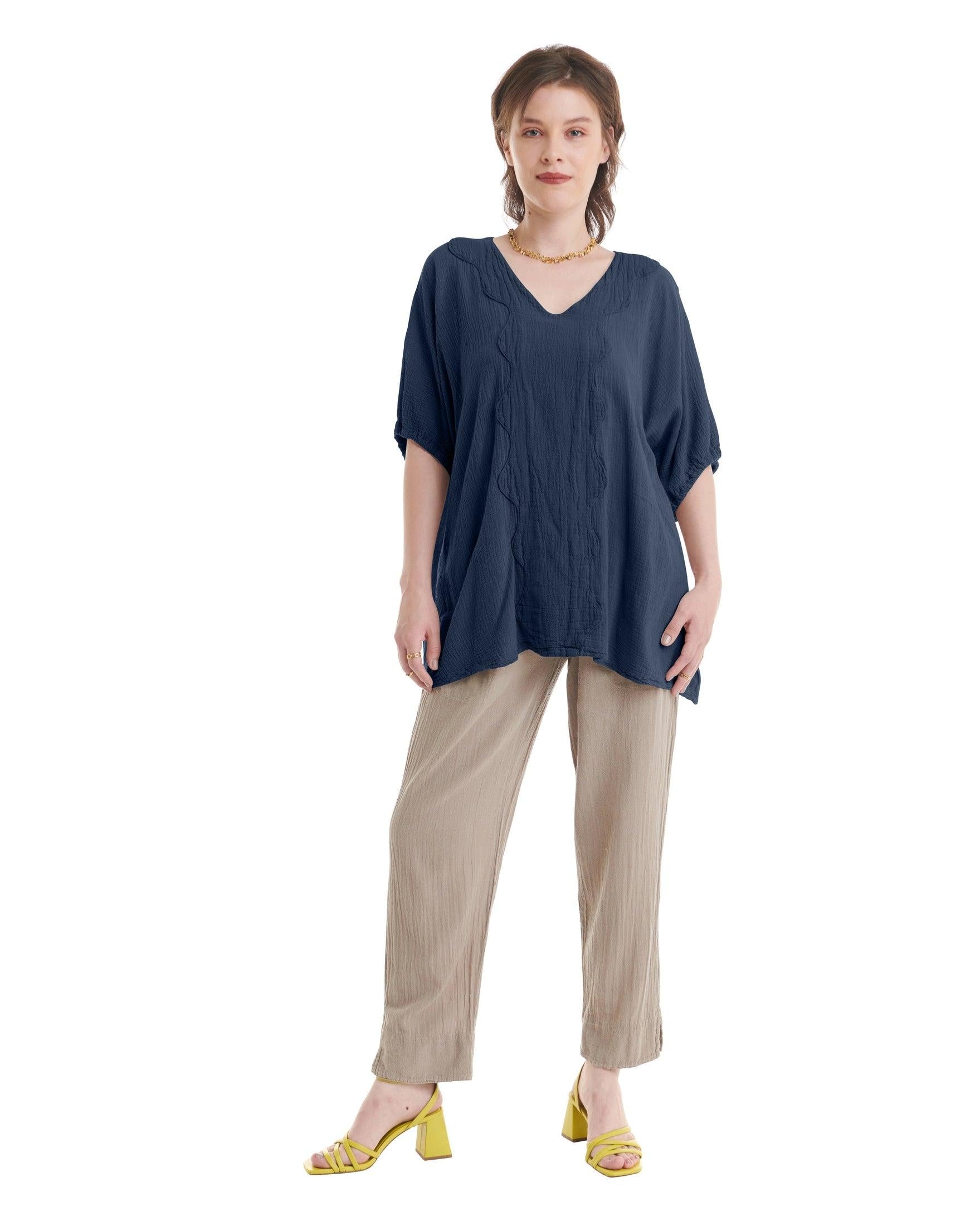 A short sleeve blouse made from our soft cotton gauze, featuring a flattering V-neckline and gathered sleeves with elastic hems. Designed for a relaxed fit with subtle front contrast detail that enhances the silhouette.