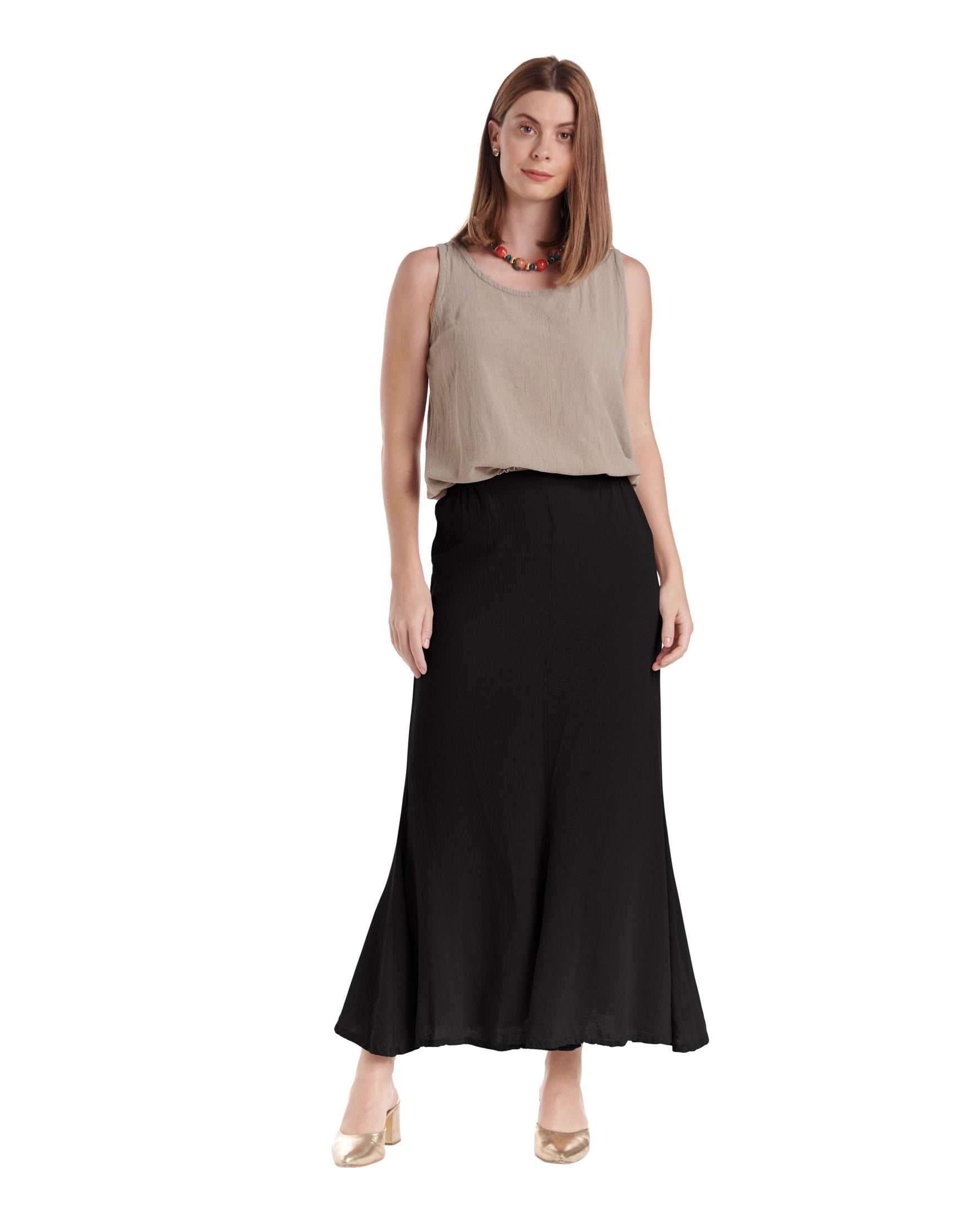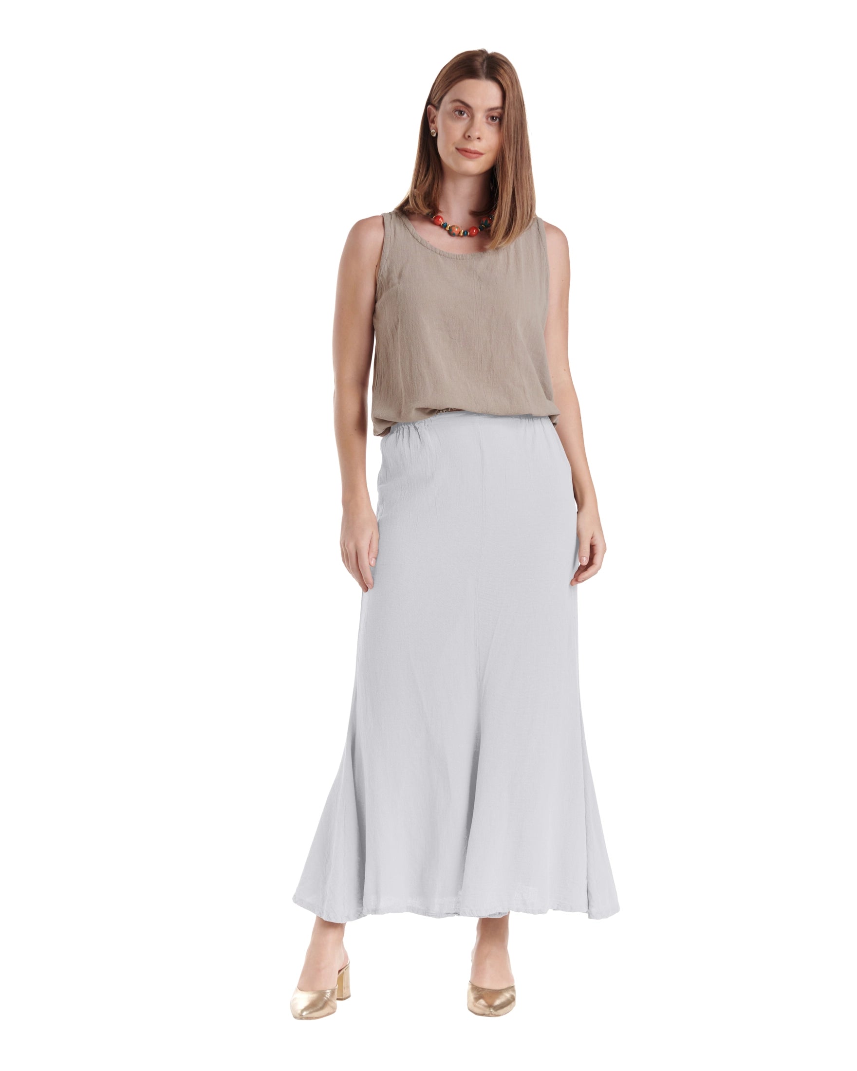 A popular, flared hemline cotton gauze skirt for a slimming look. Very flattering!