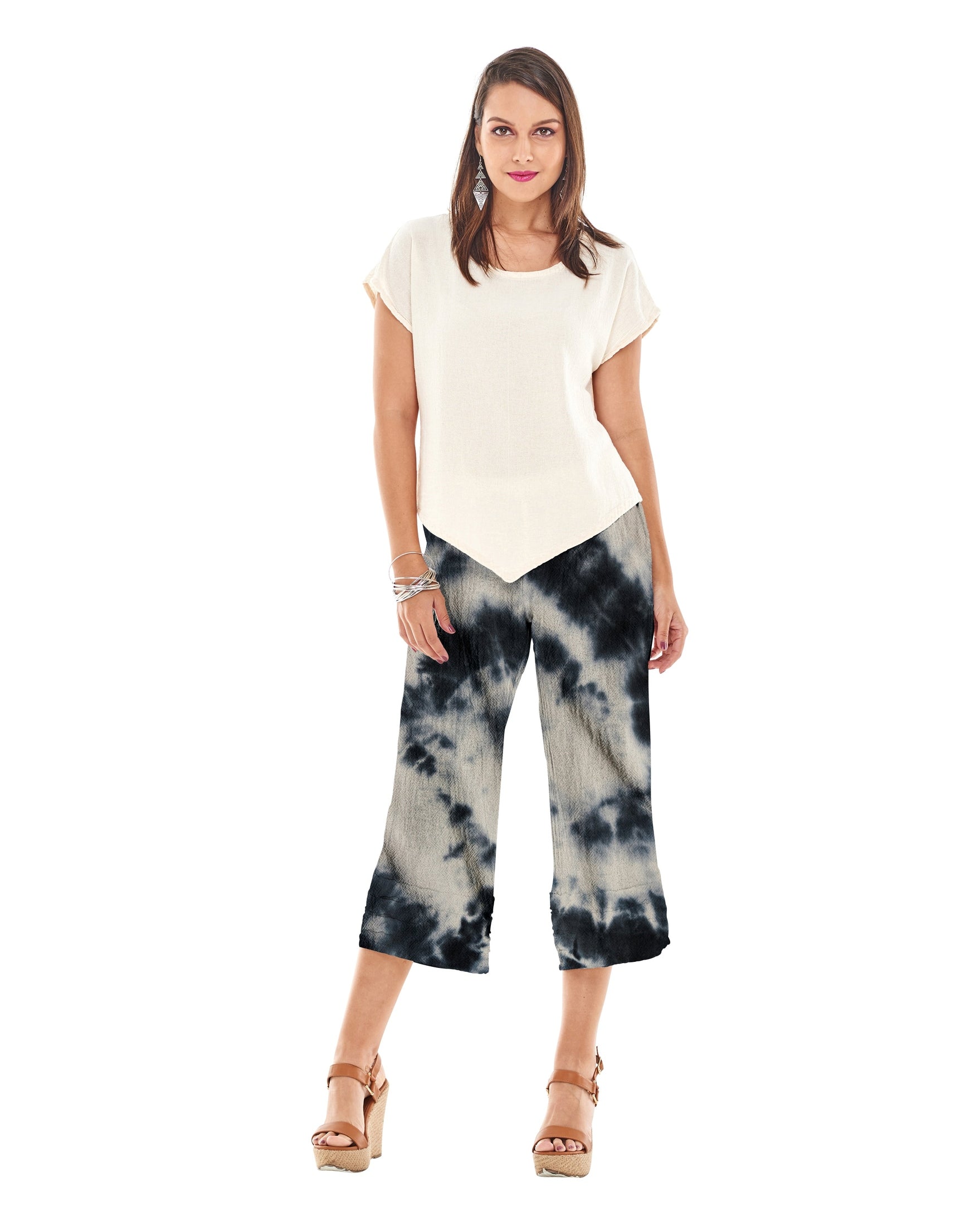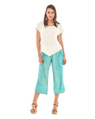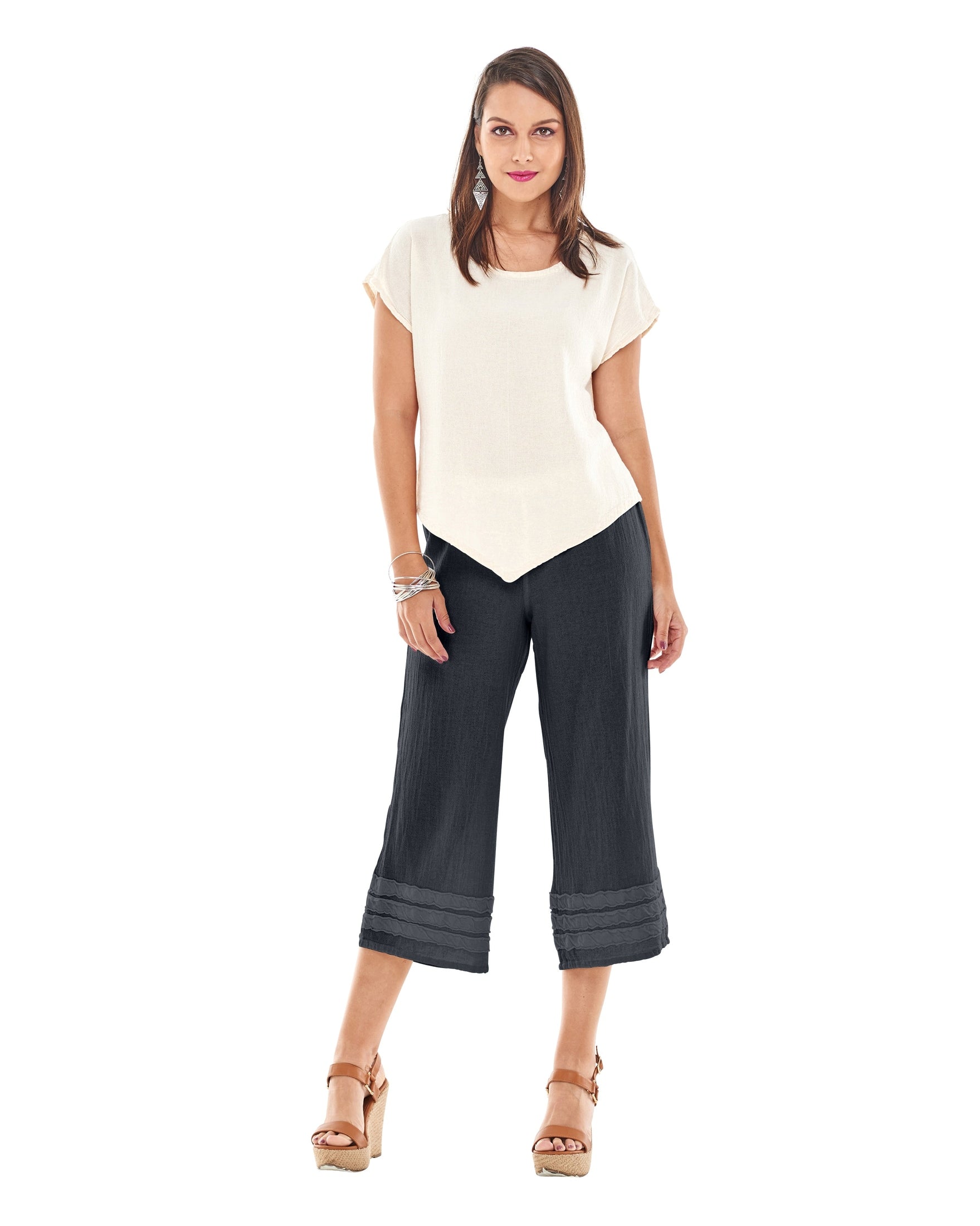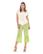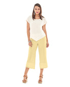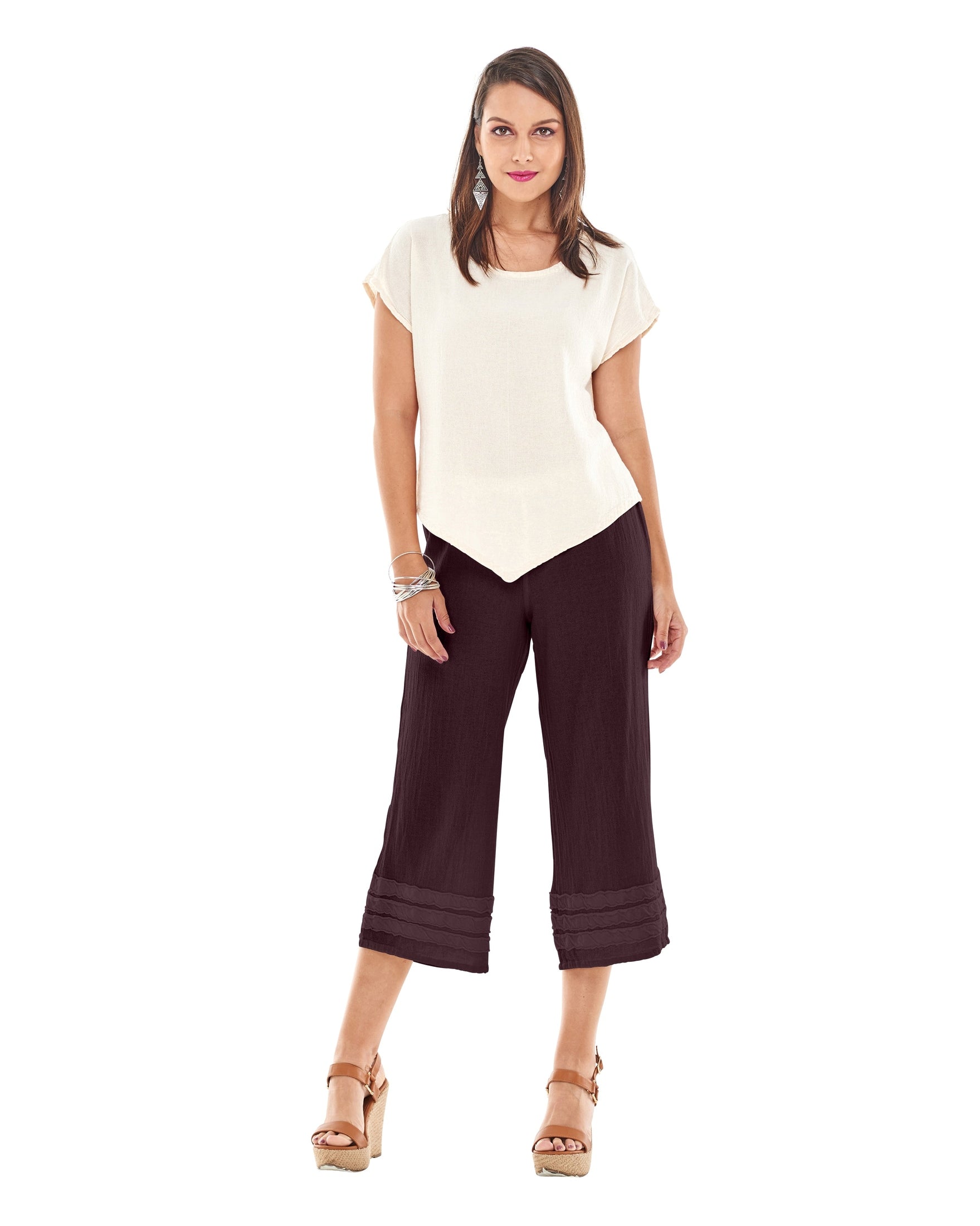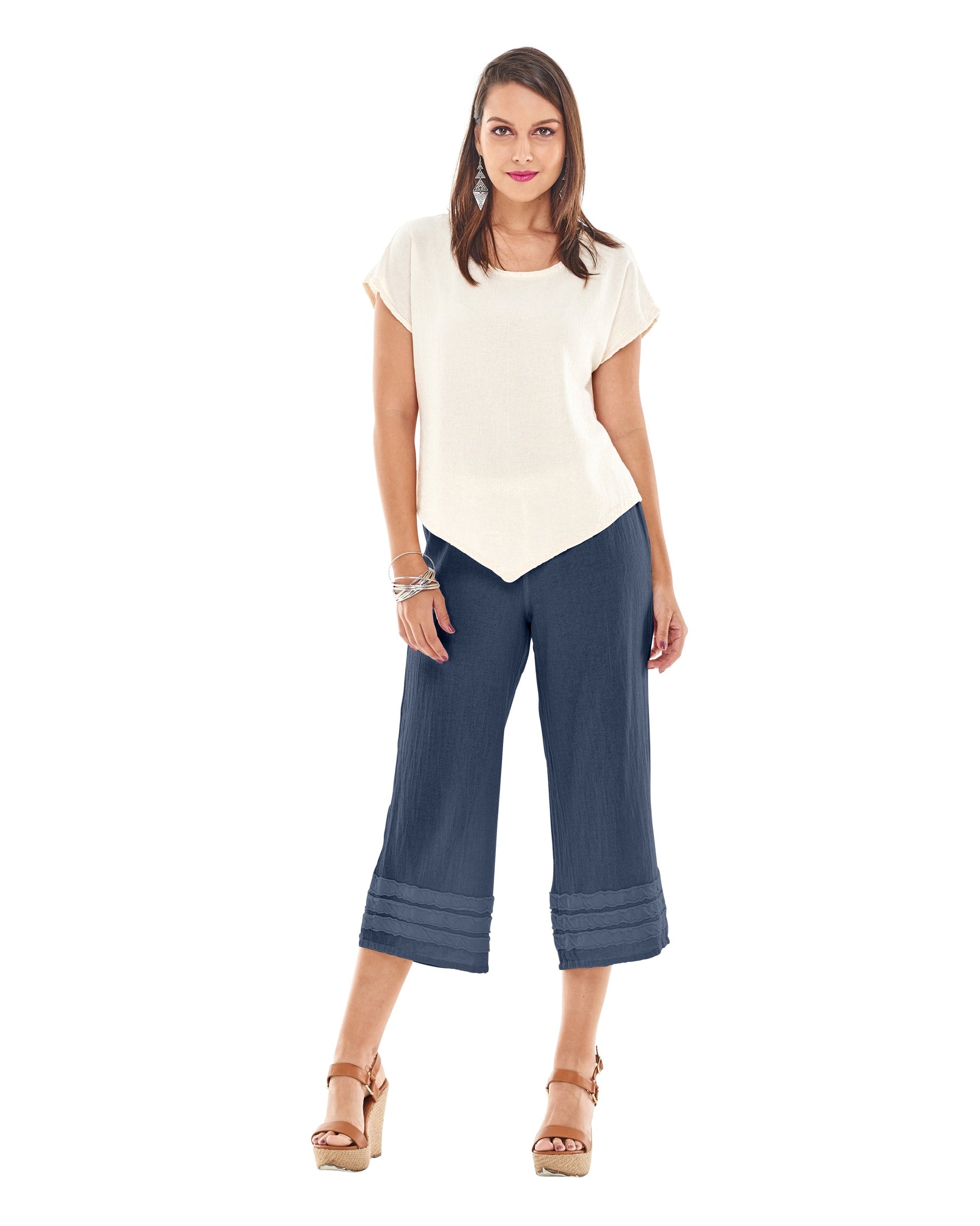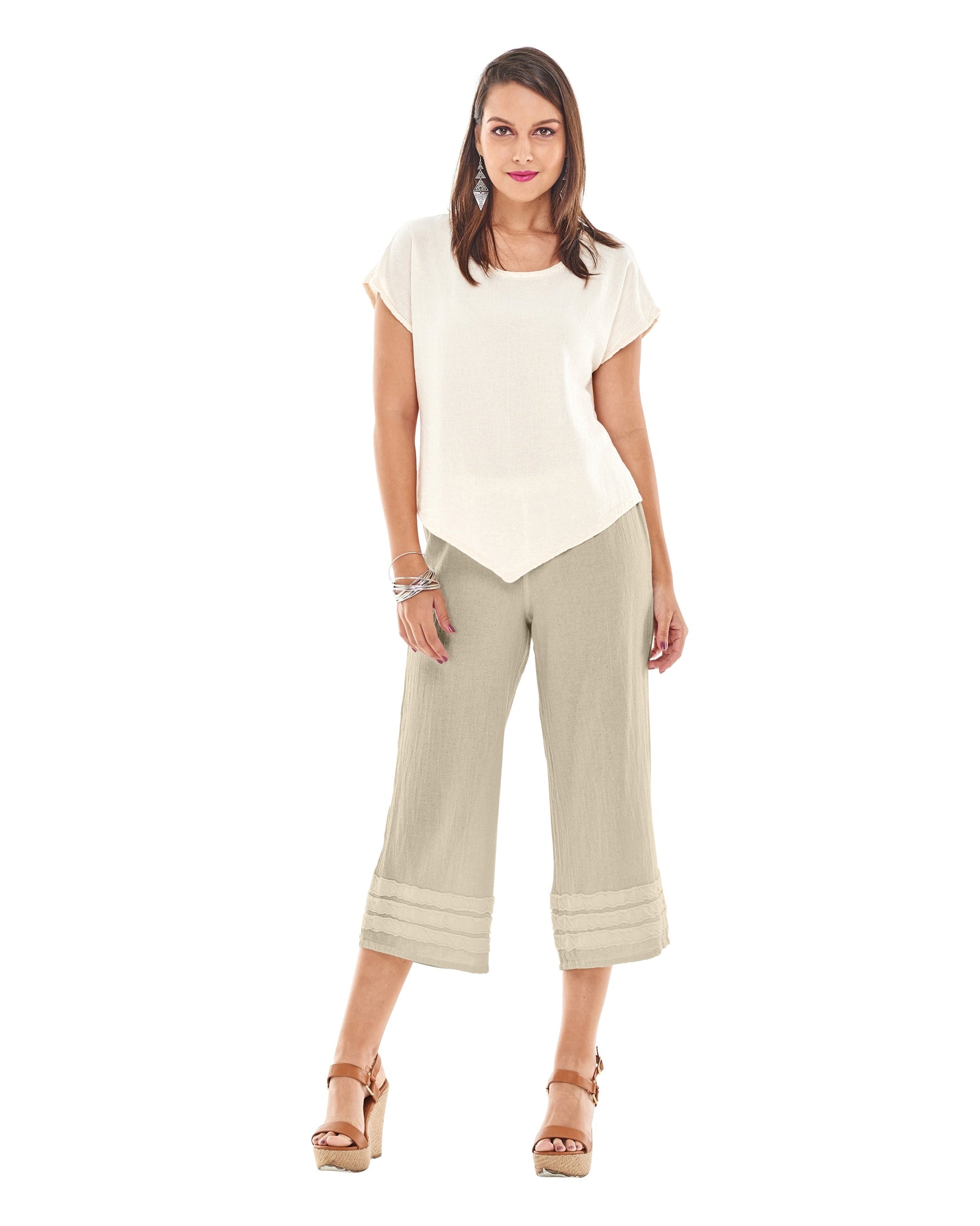 A wide-legged cropped cotton gauze pant featuring striped applique detail at the hemline for a subtle, stylish accent.