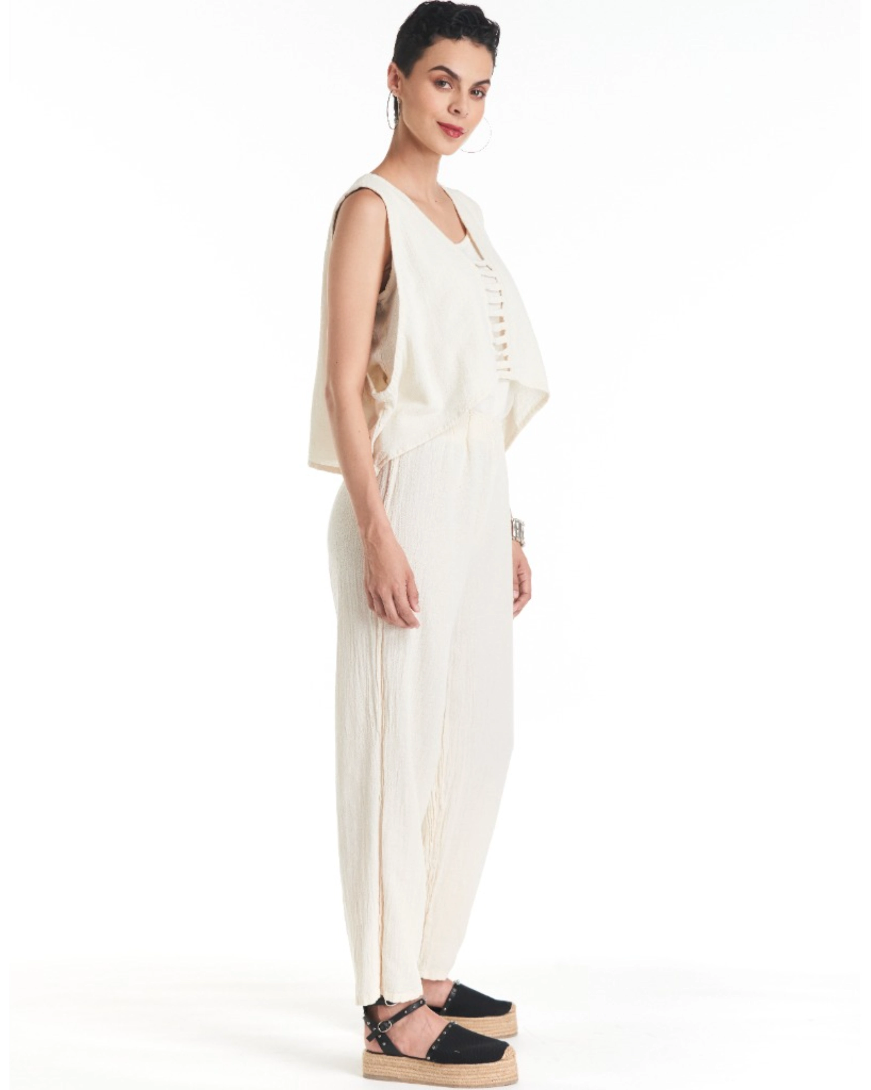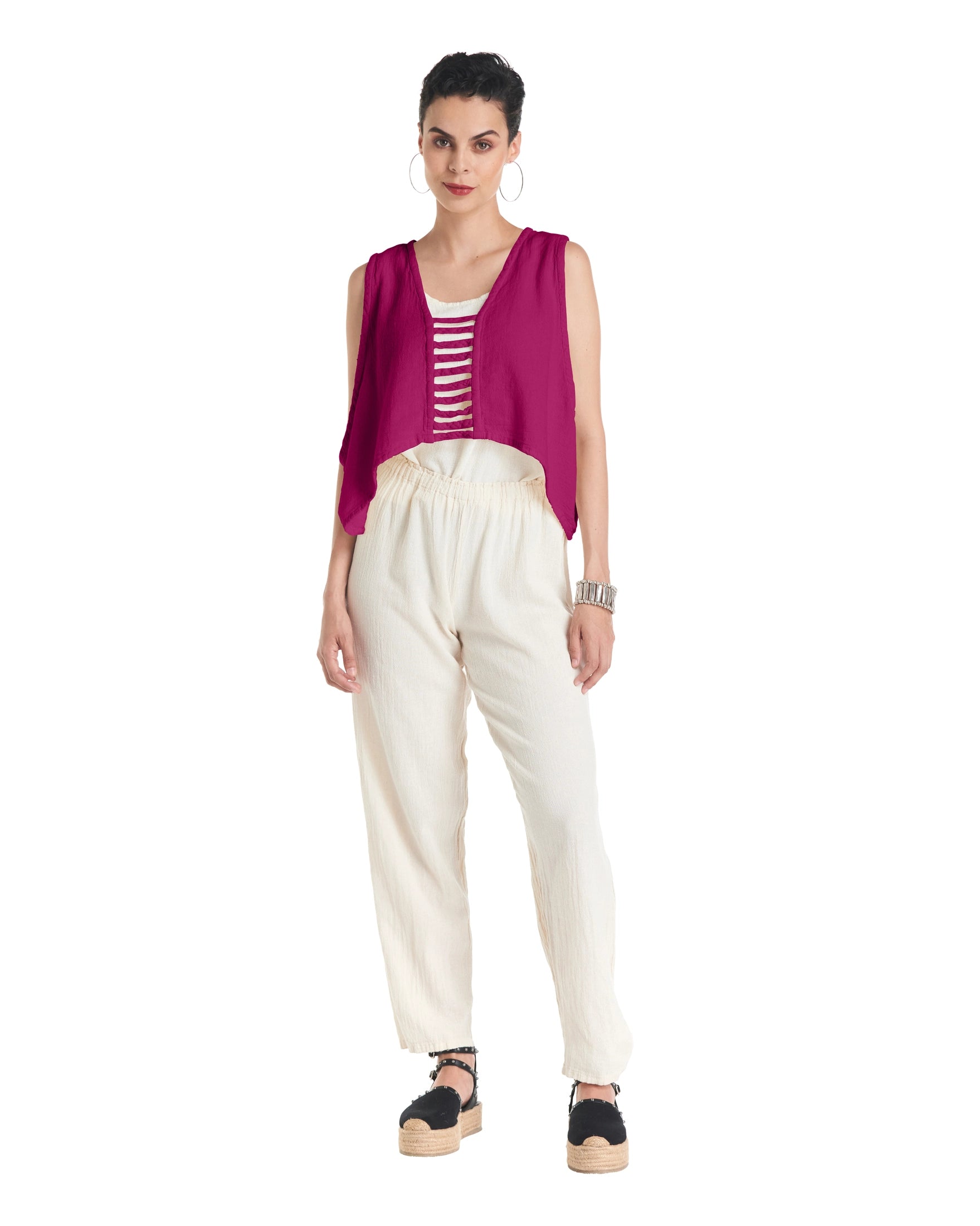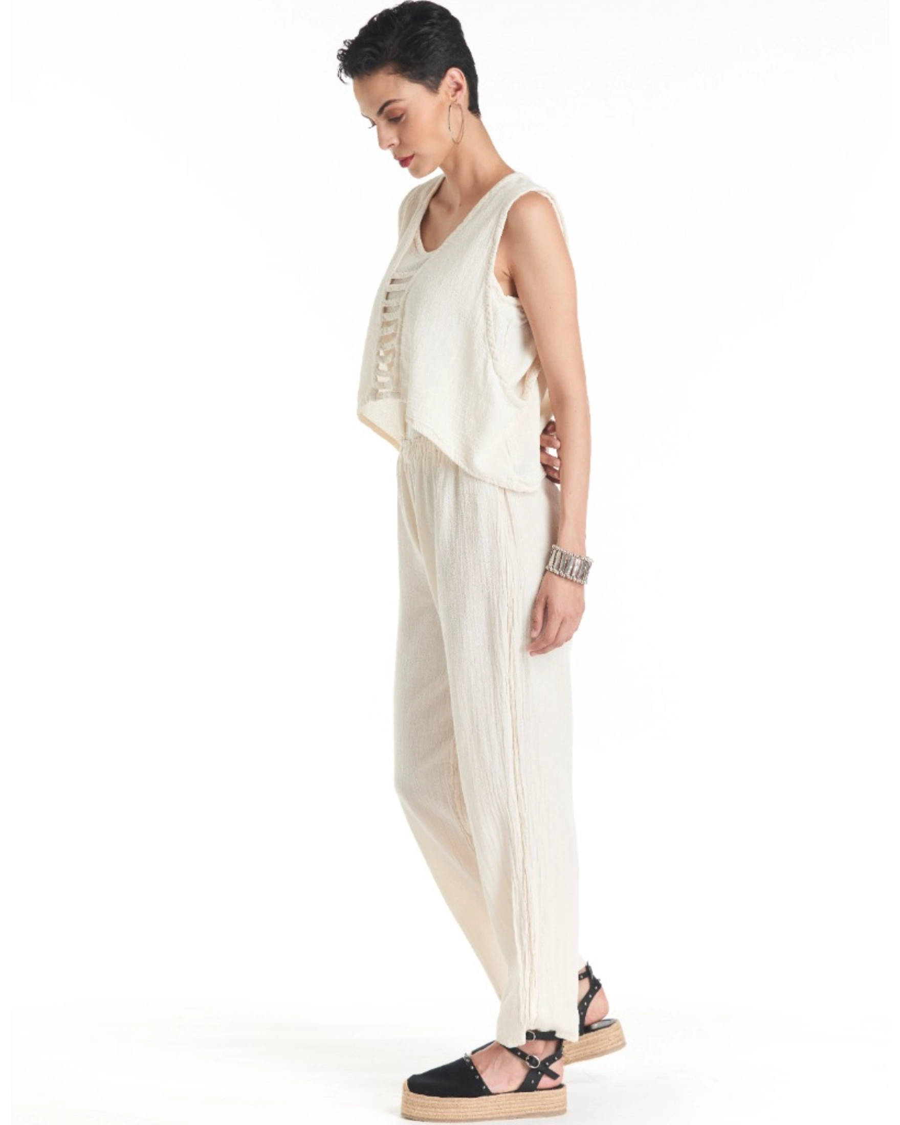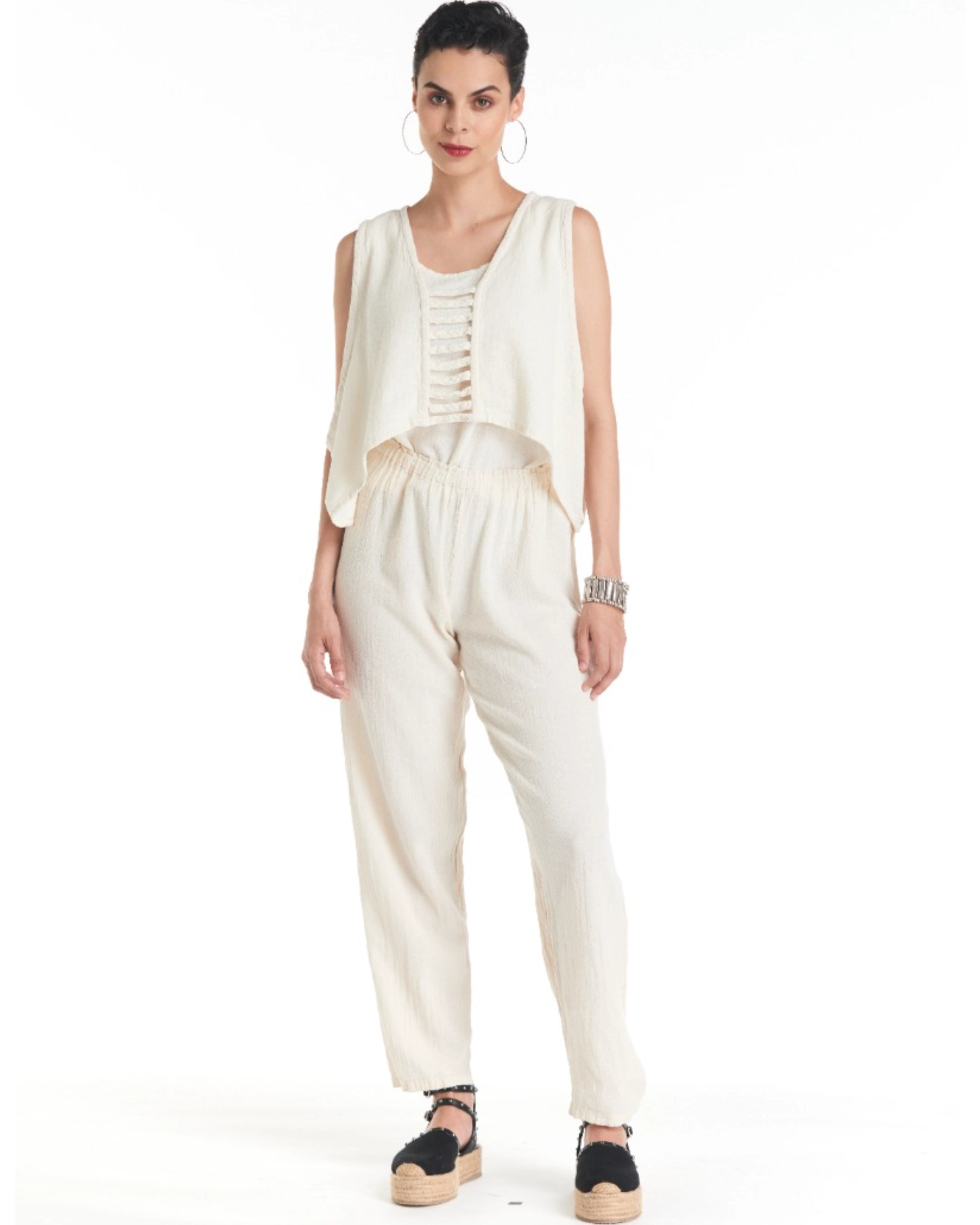A cropped, cotton gauze vest with horizontal cutout slats down the front. Great for layering!