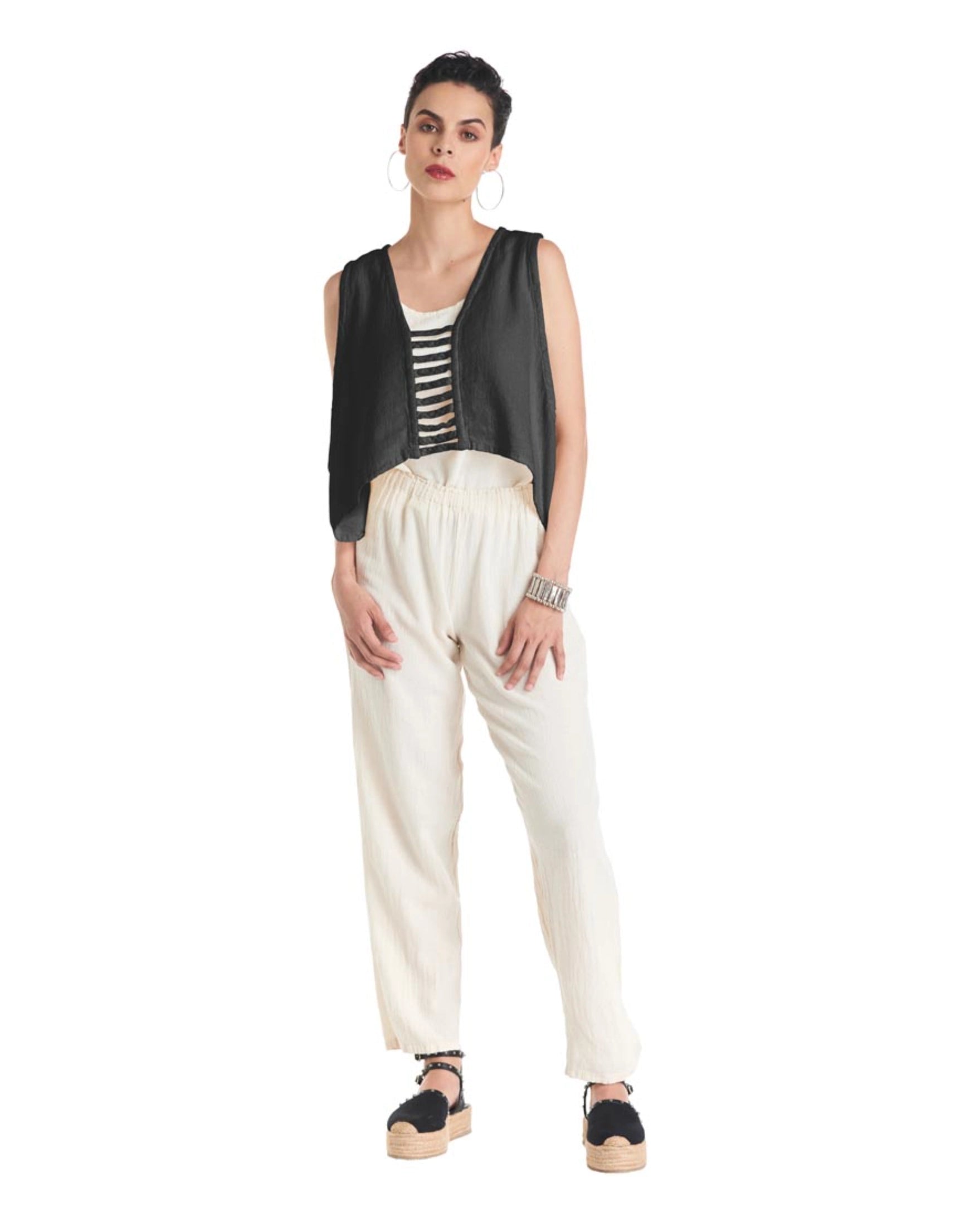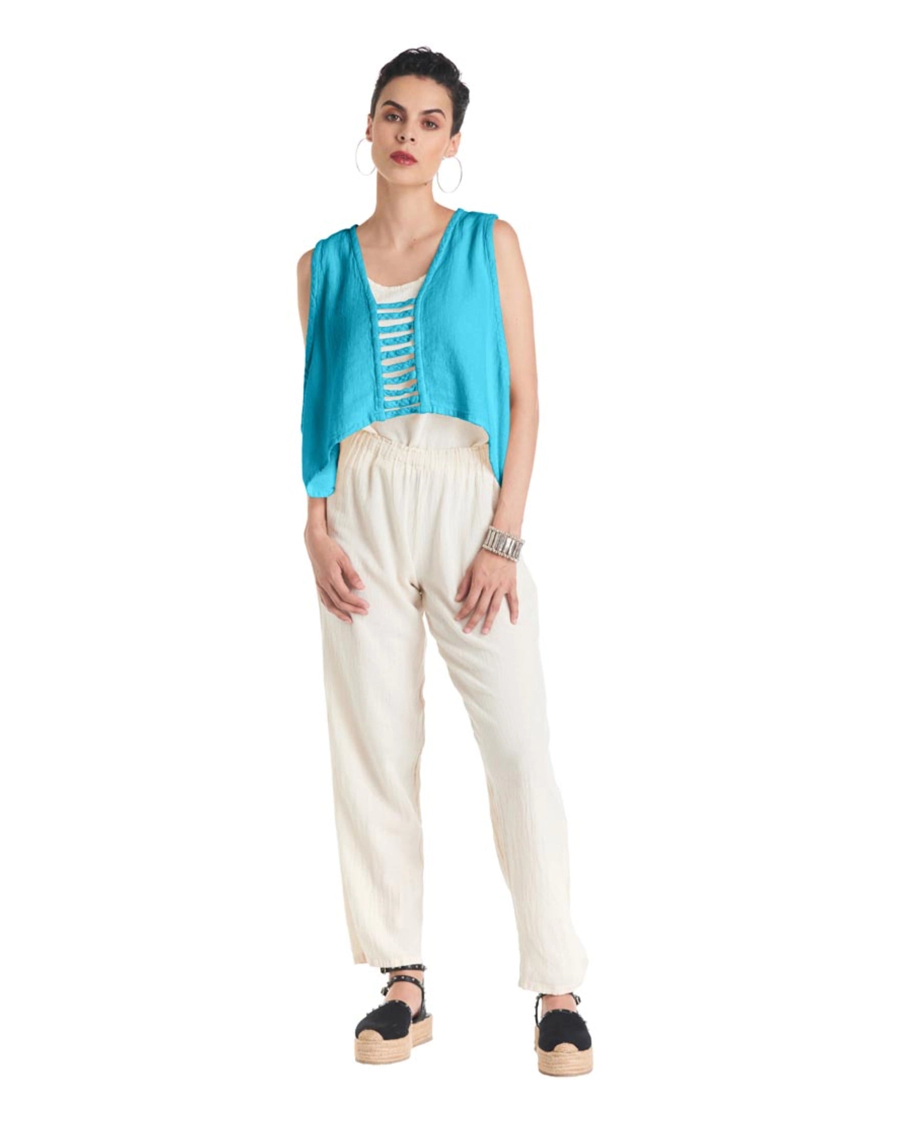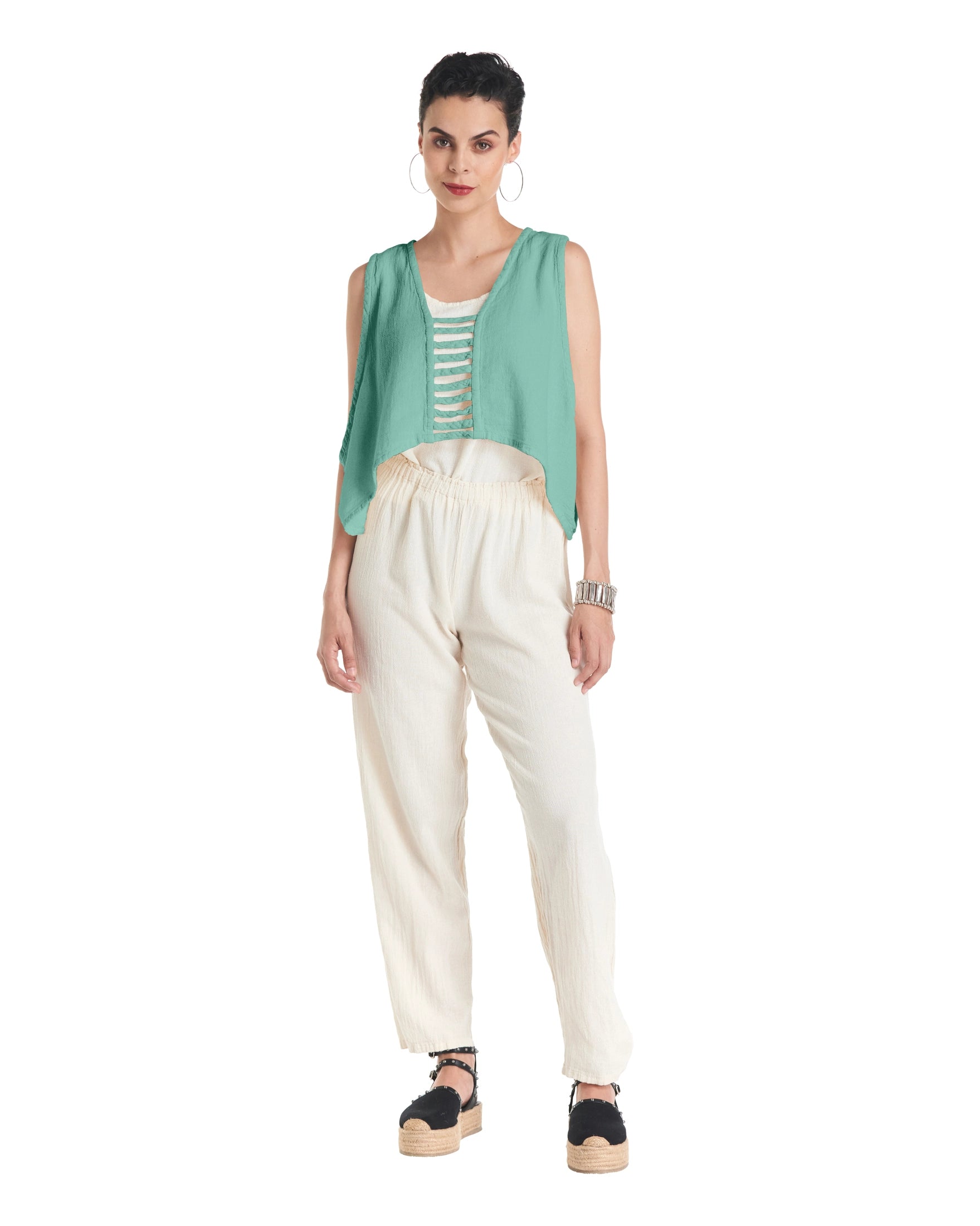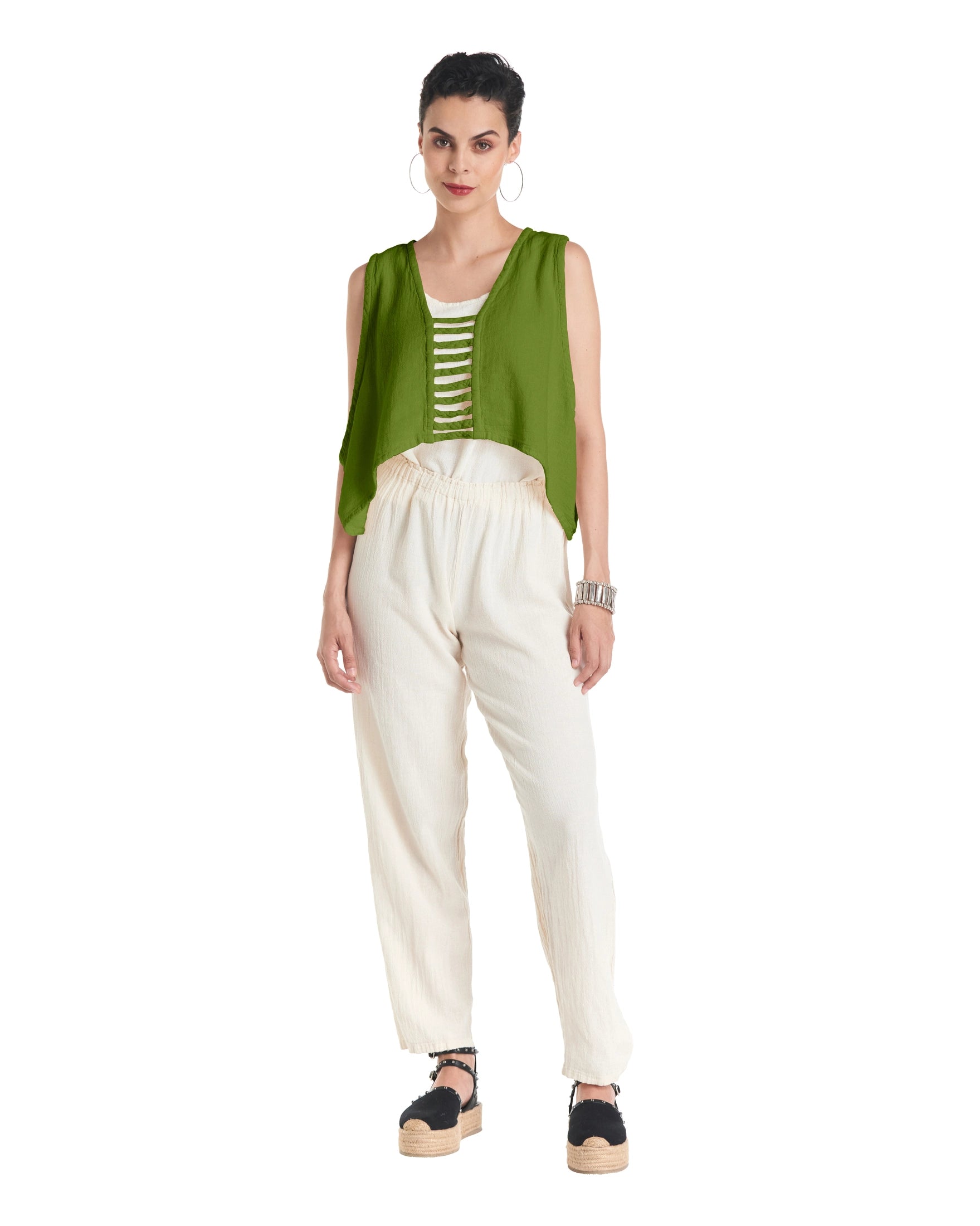 A cropped, cotton gauze vest with horizontal cutout slats down the front. Great for layering!