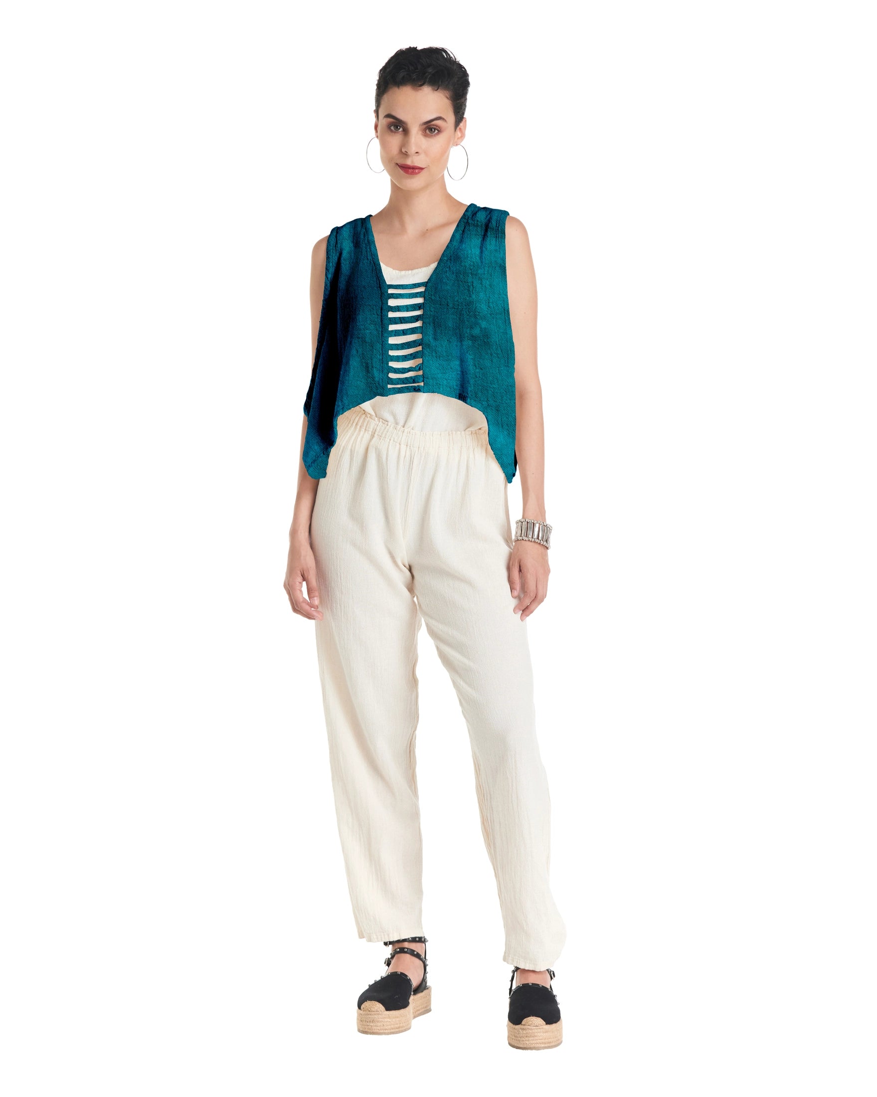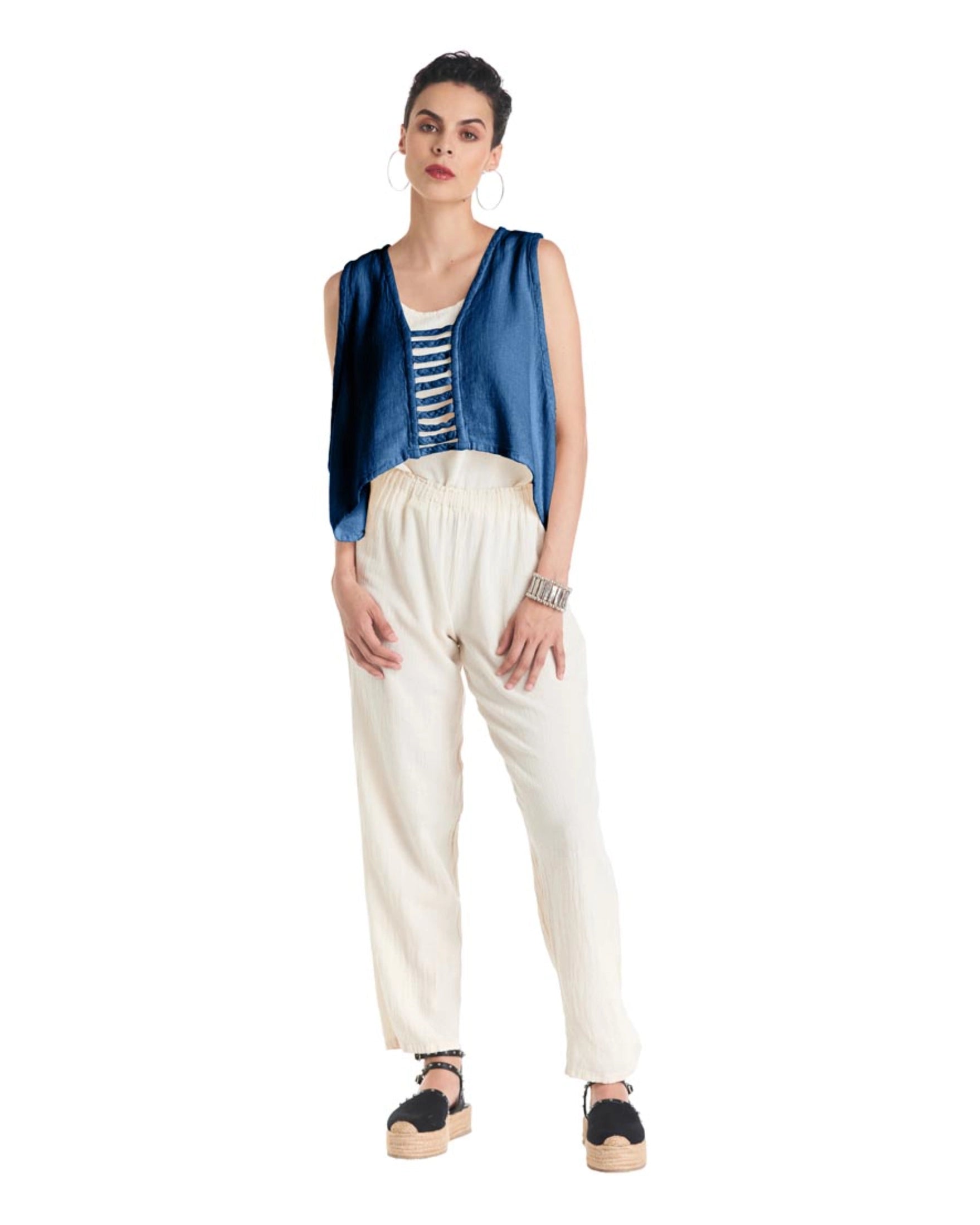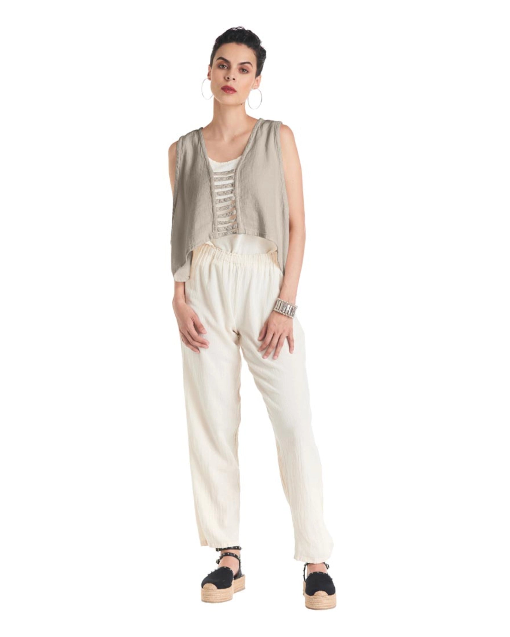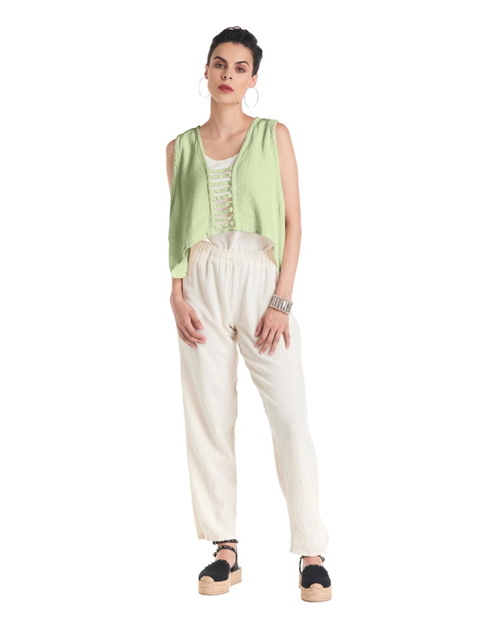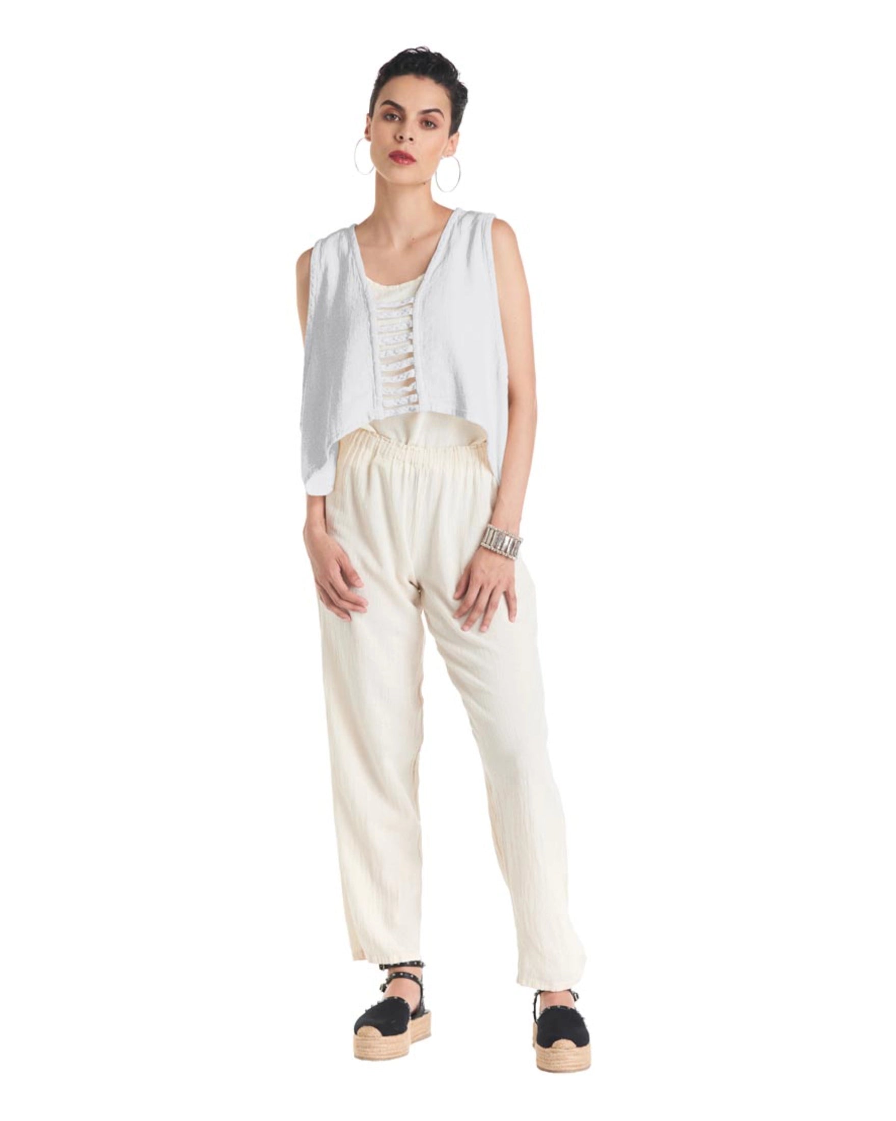 A cropped, cotton gauze vest with horizontal cutout slats down the front. Great for layering!
