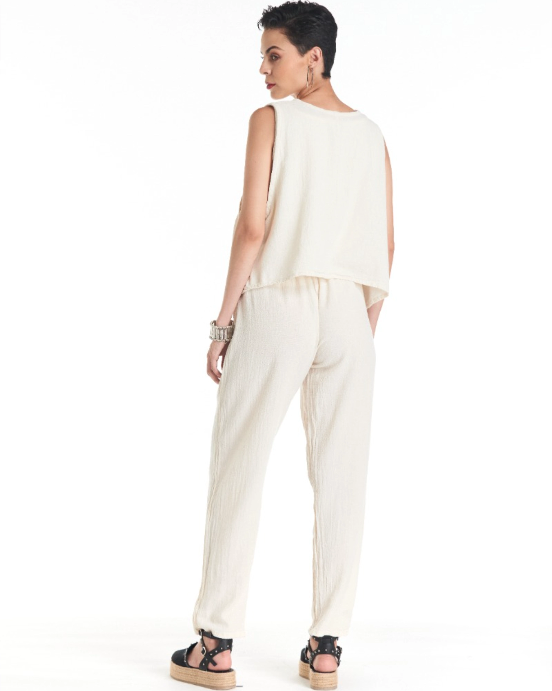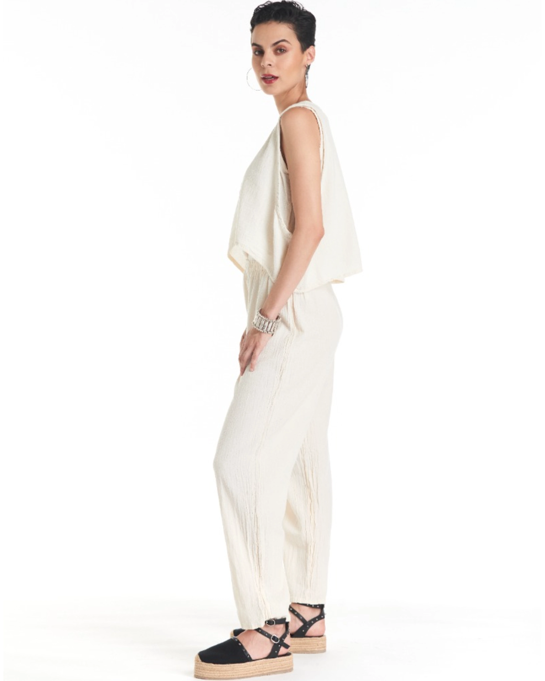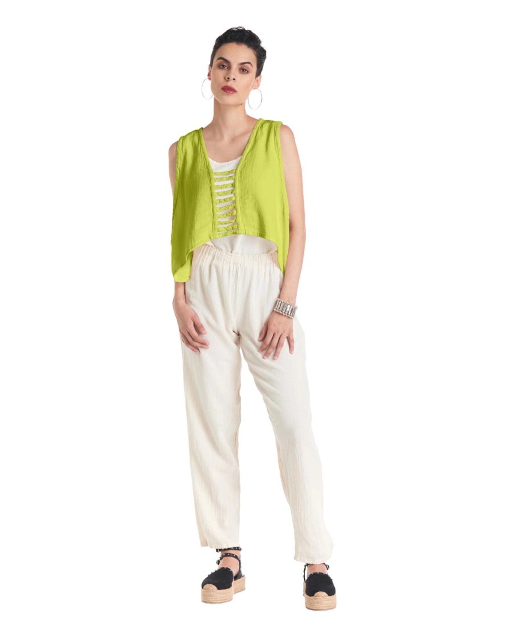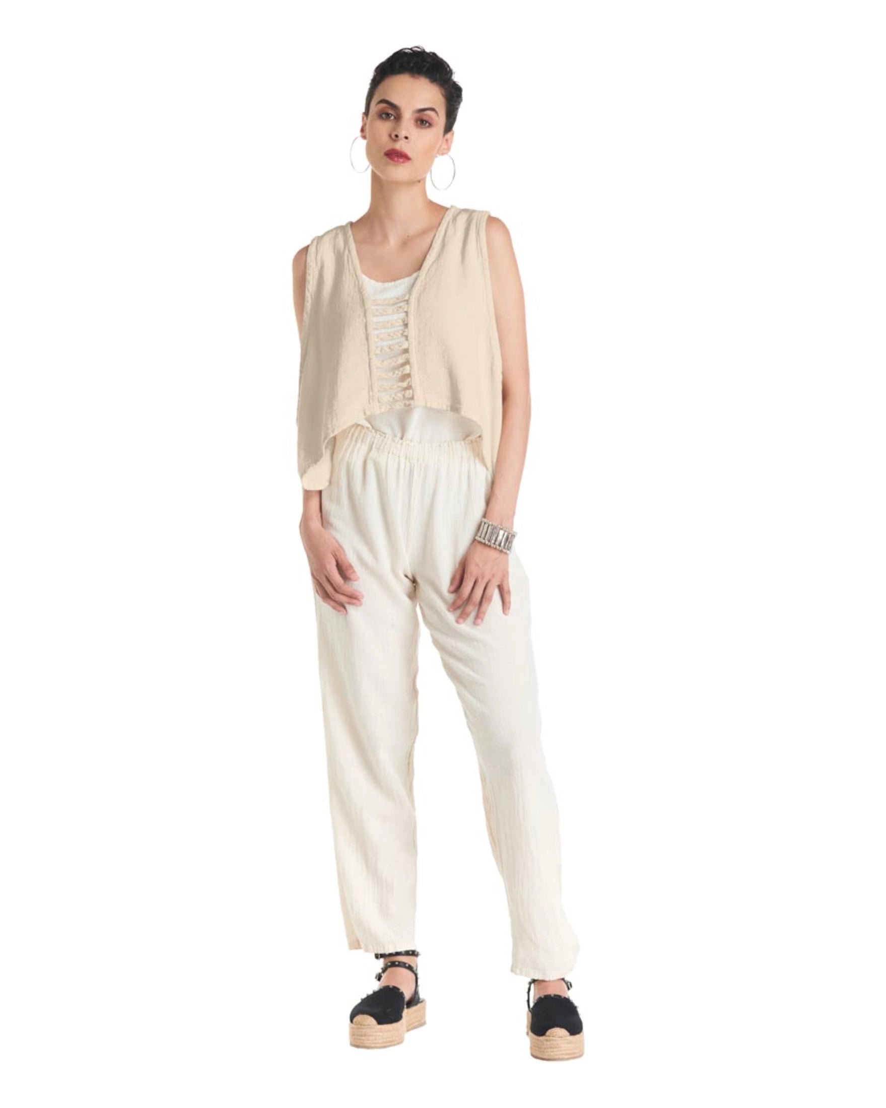 A cropped, cotton gauze vest with horizontal cutout slats down the front. Great for layering!