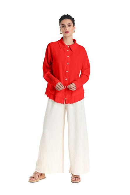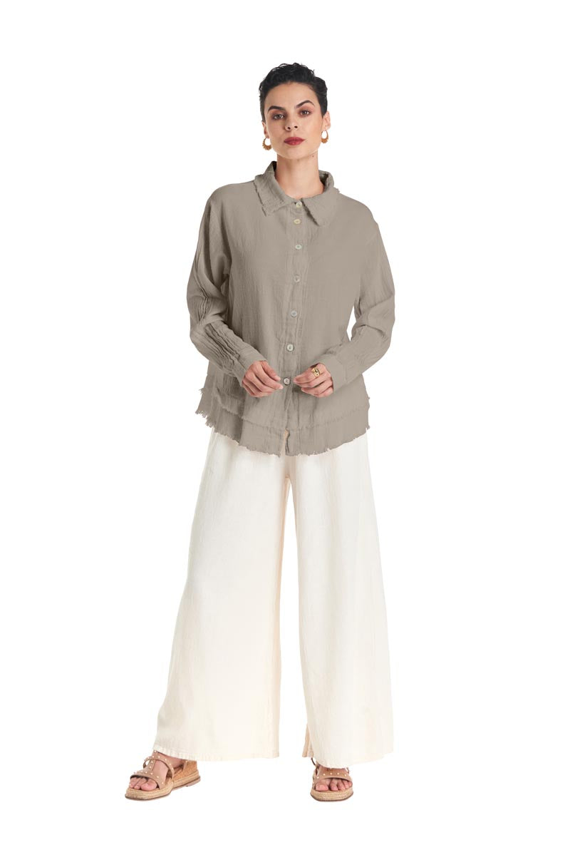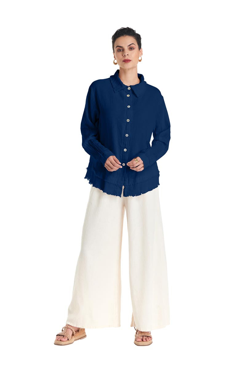 A long-sleeve cotton gauze button-down top features a unique fringed collar and double-fringed hemline. Small cuffs with button closures add a refined finish, combining effortless comfort with distinctive, stylish details.